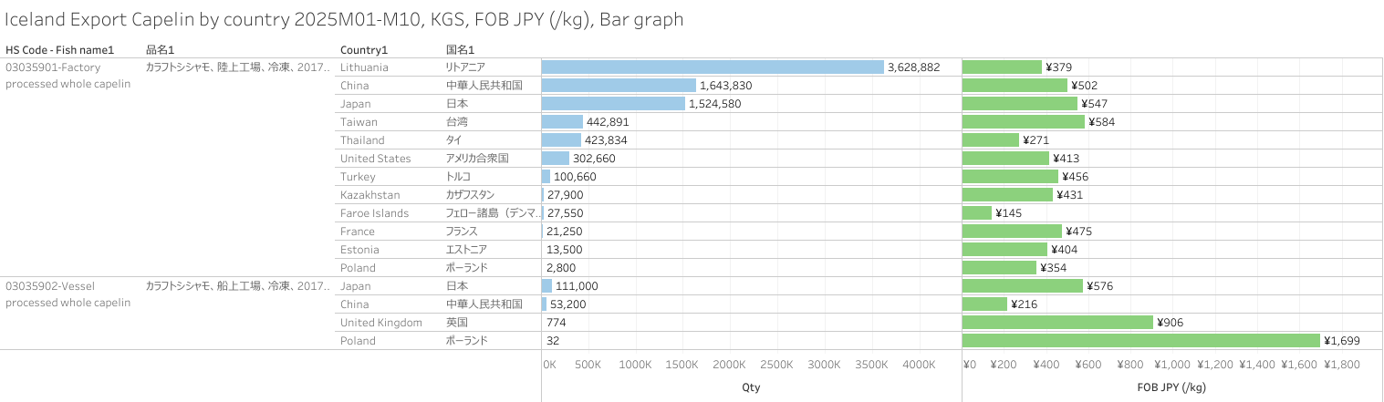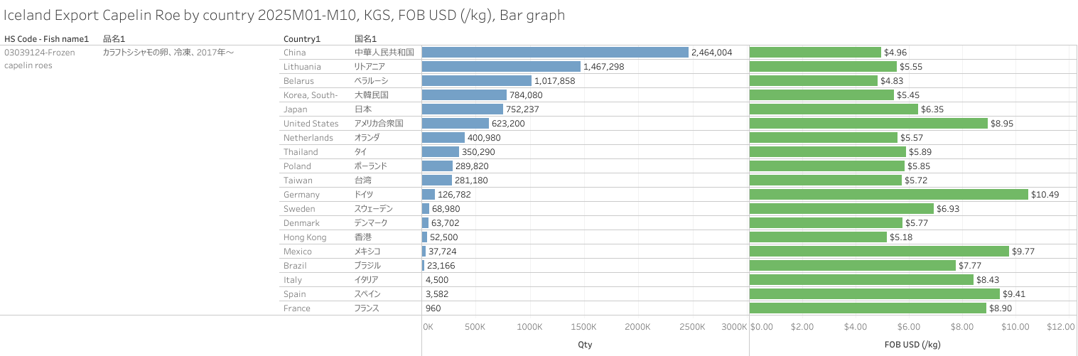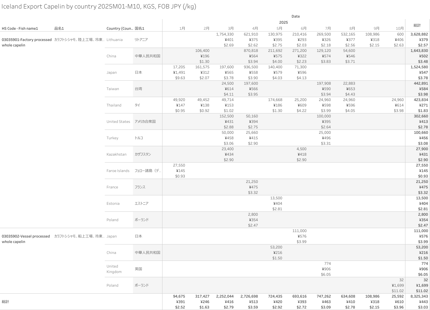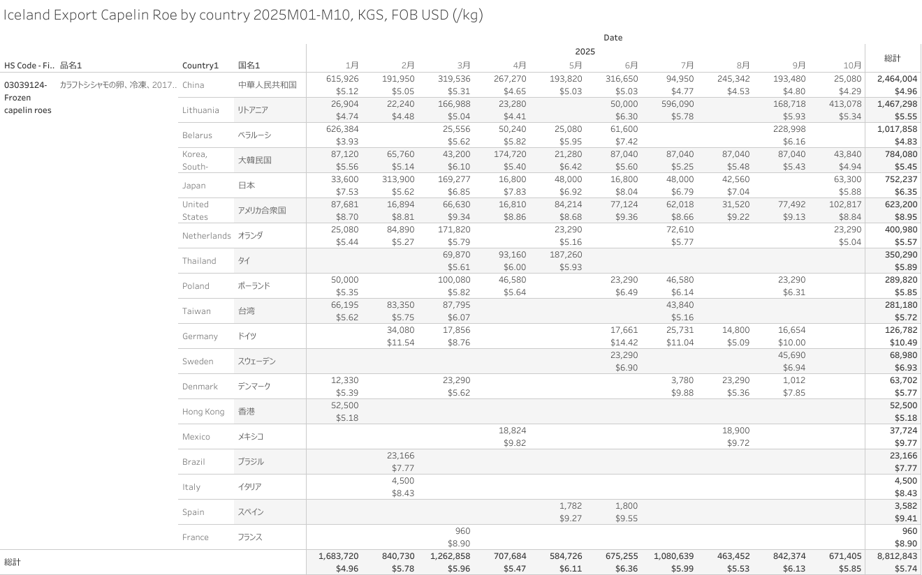 アイスランド カラフトシシャモ(親+卵)(HS-03) 輸出統計 2025年10月