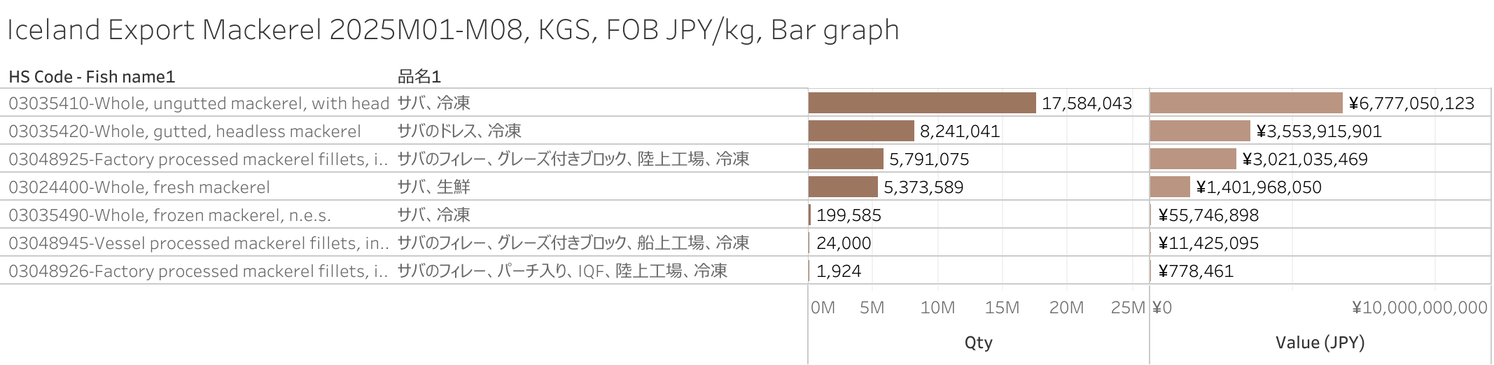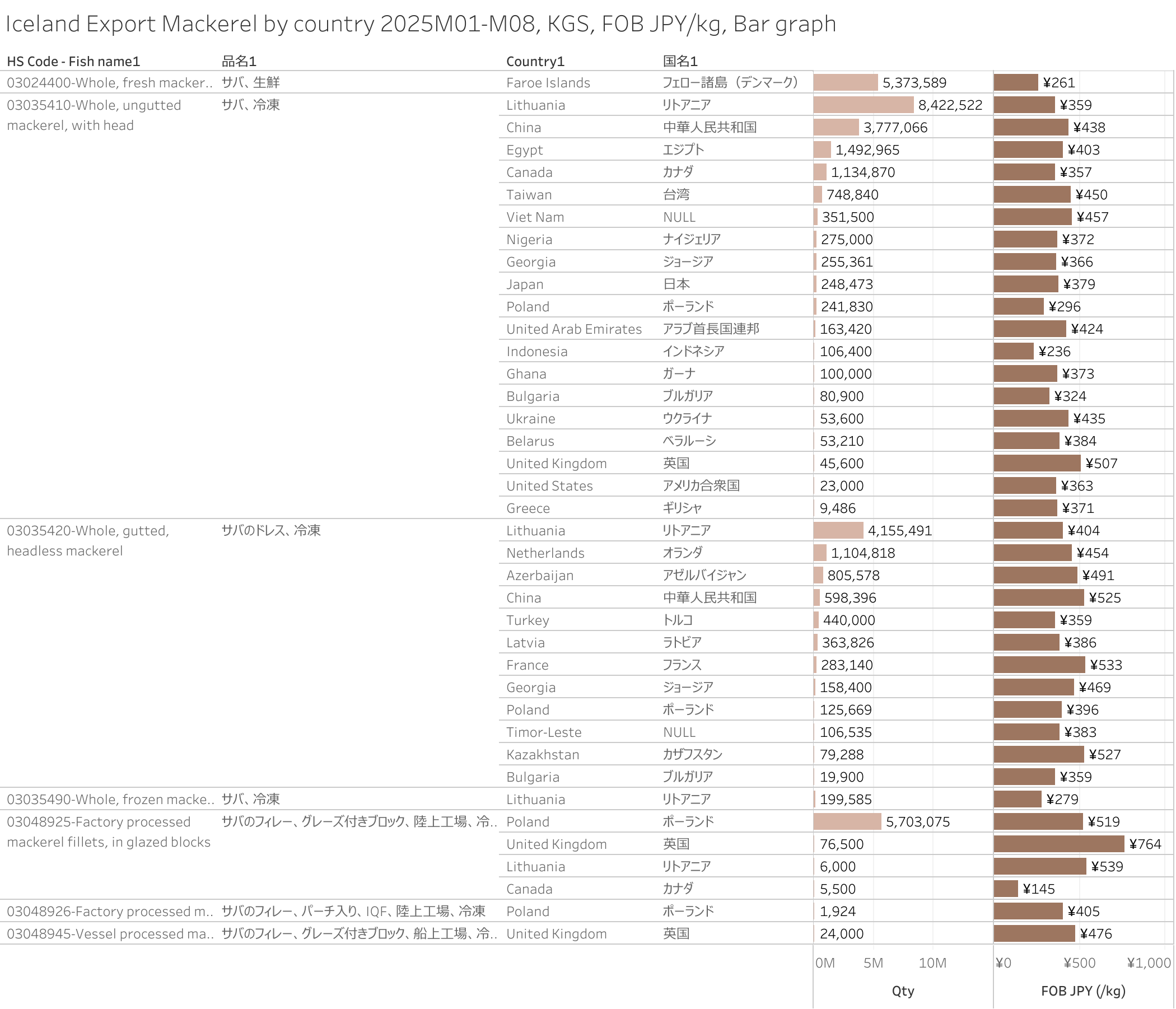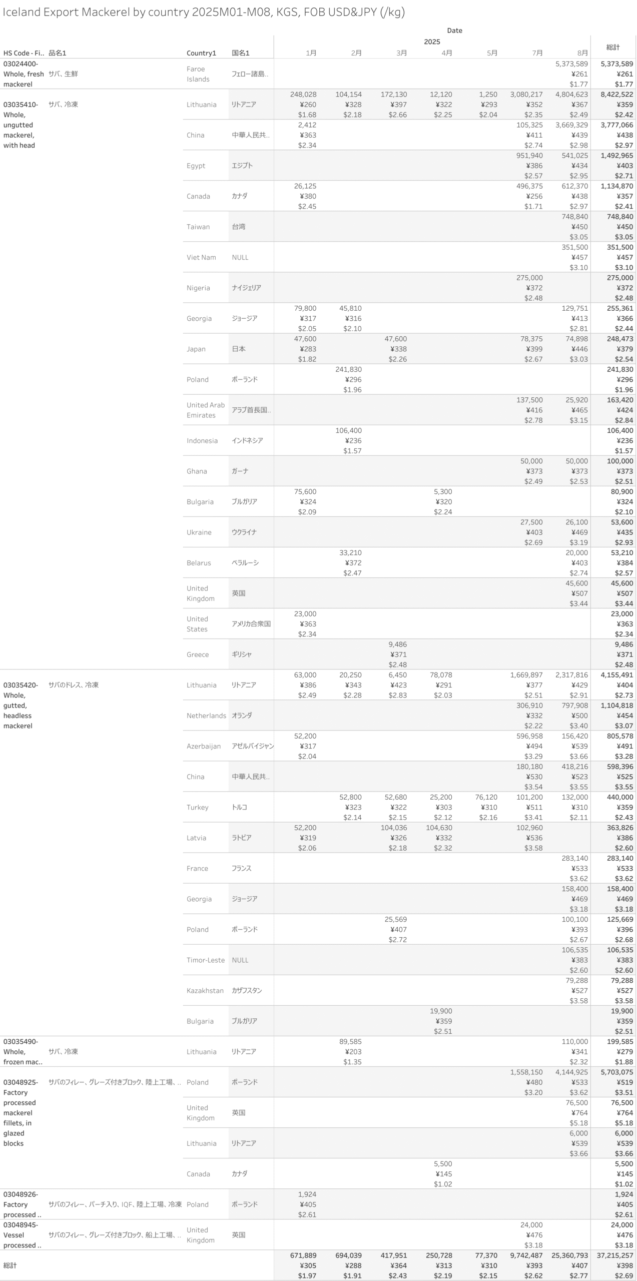アイスランド サバ(HS-03) 輸出統計 2025年08月まで