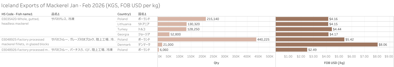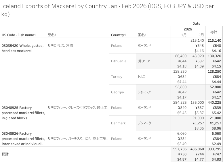 アイスランド サバ(HS-03) 輸出統計 2026年2月まで