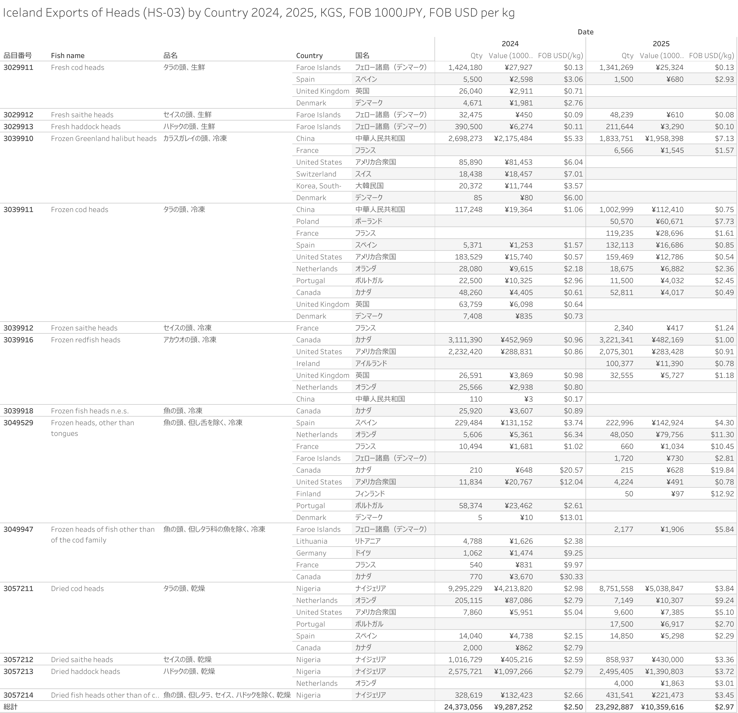 アイスランド 魚の頭(HS-03)輸出統計 2025年12月まで