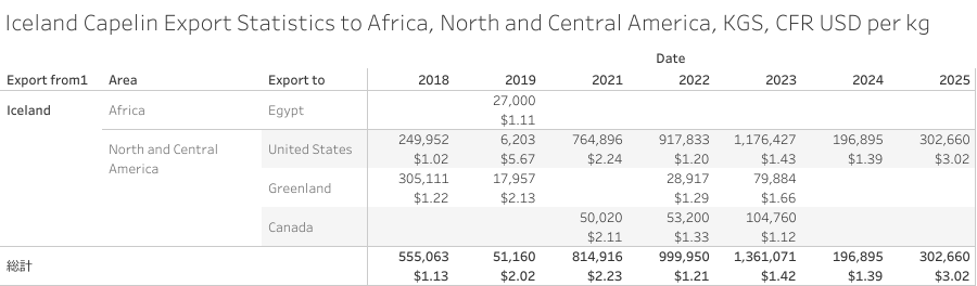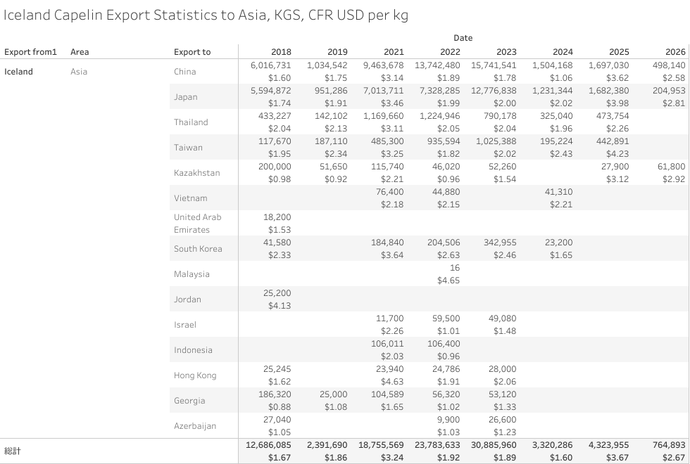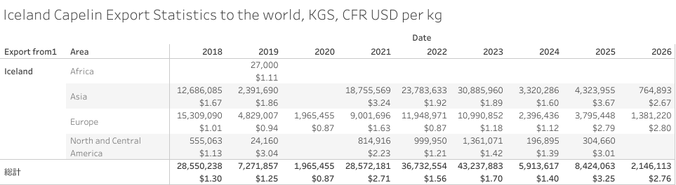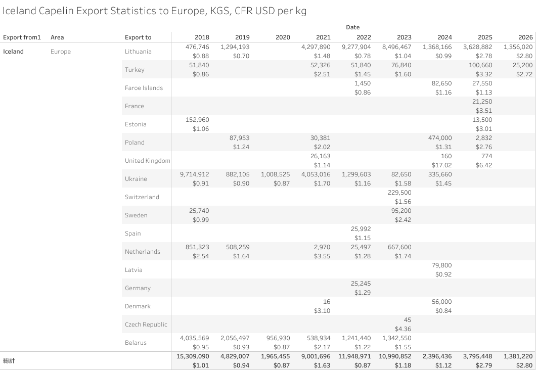 アイスランドからのカラフトシシャモ輸出統計 2018-2026年2月