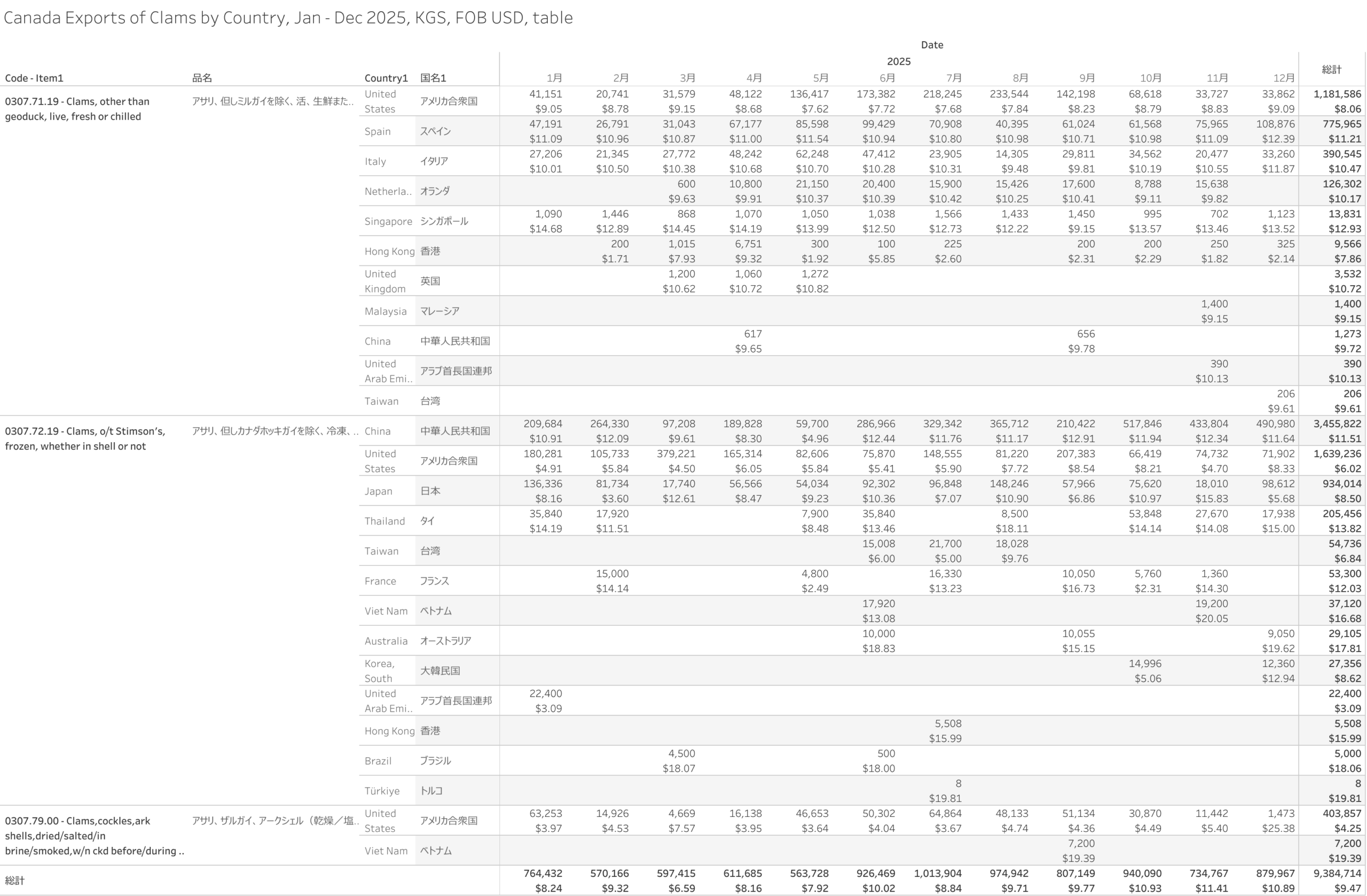 Canada Exports of Clams (HS-03) Jan - Dec 2025