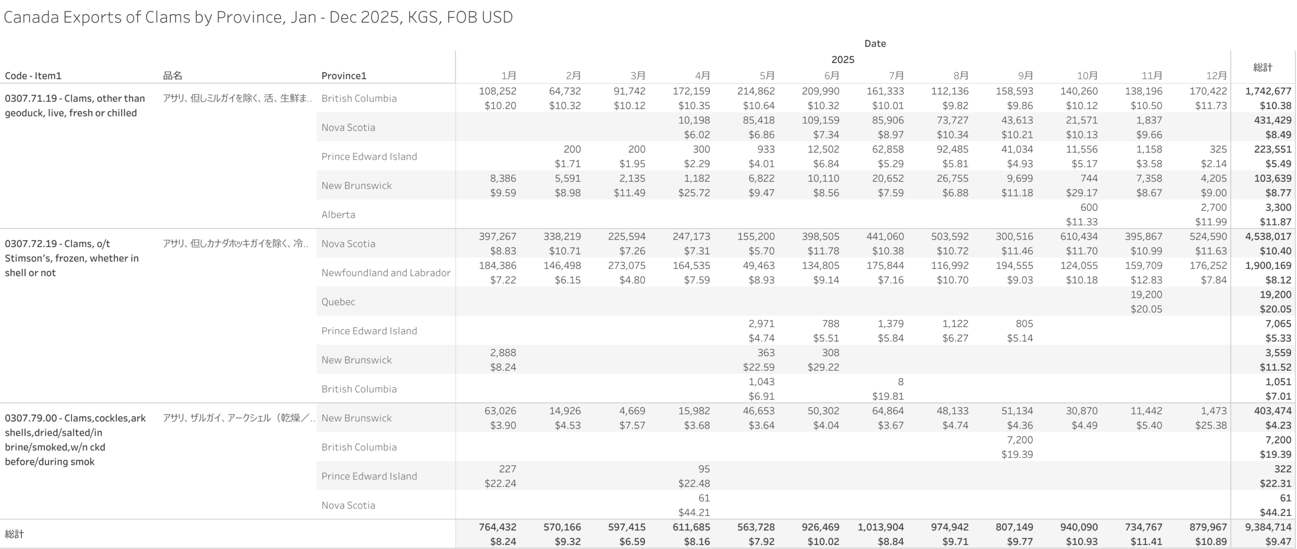 カナダ アサリ(HS-03)輸出統計 2025年12月まで