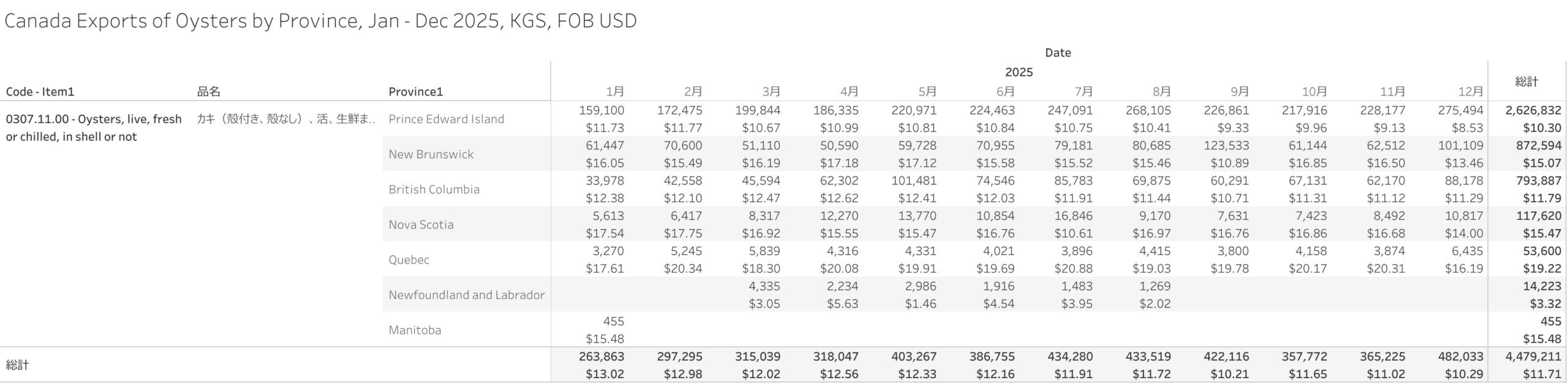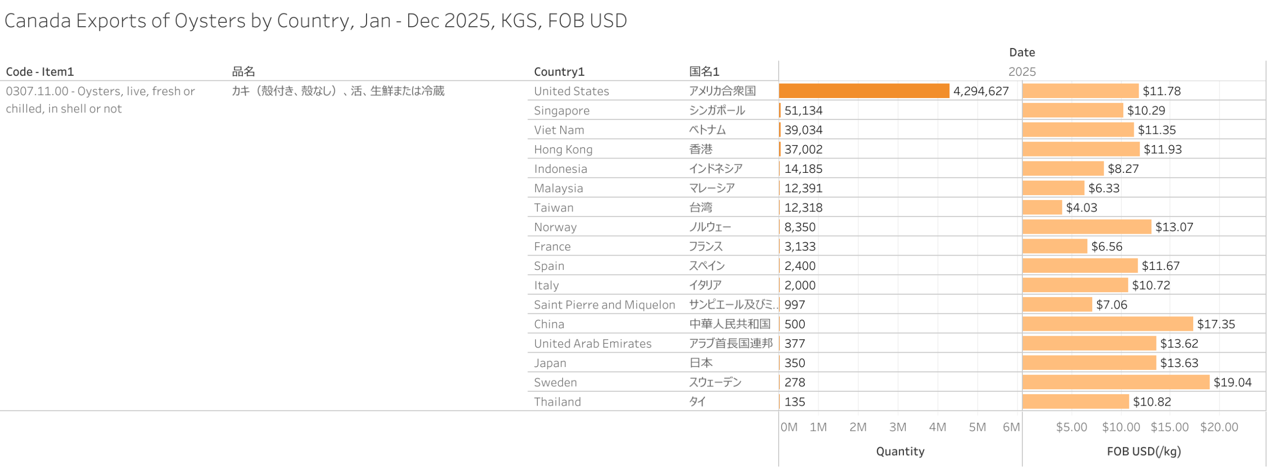 Canada Exports of Oysters (HS-03) Jan - Dec 2025