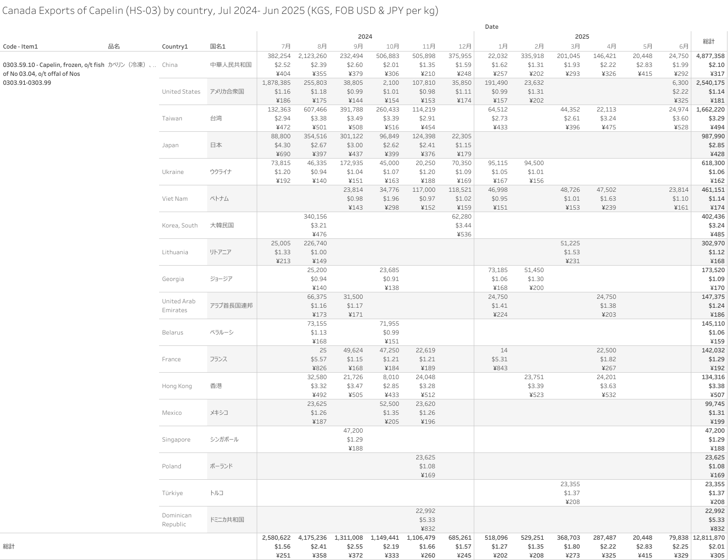 カナダ カラフトシシャモ輸出統計 2025年07-09月