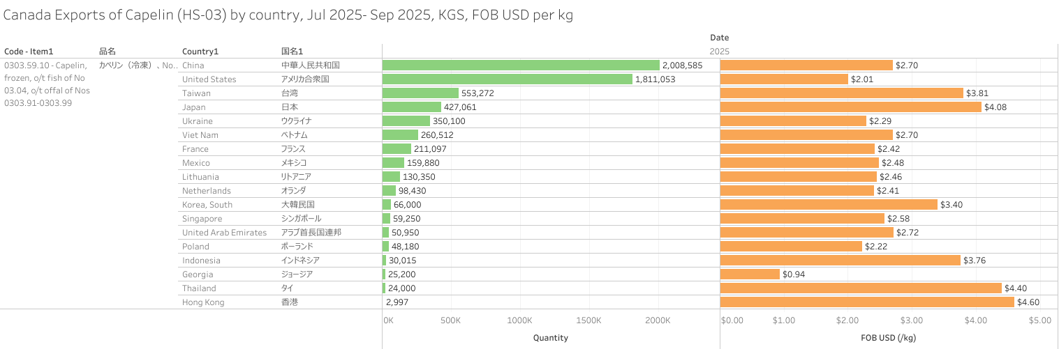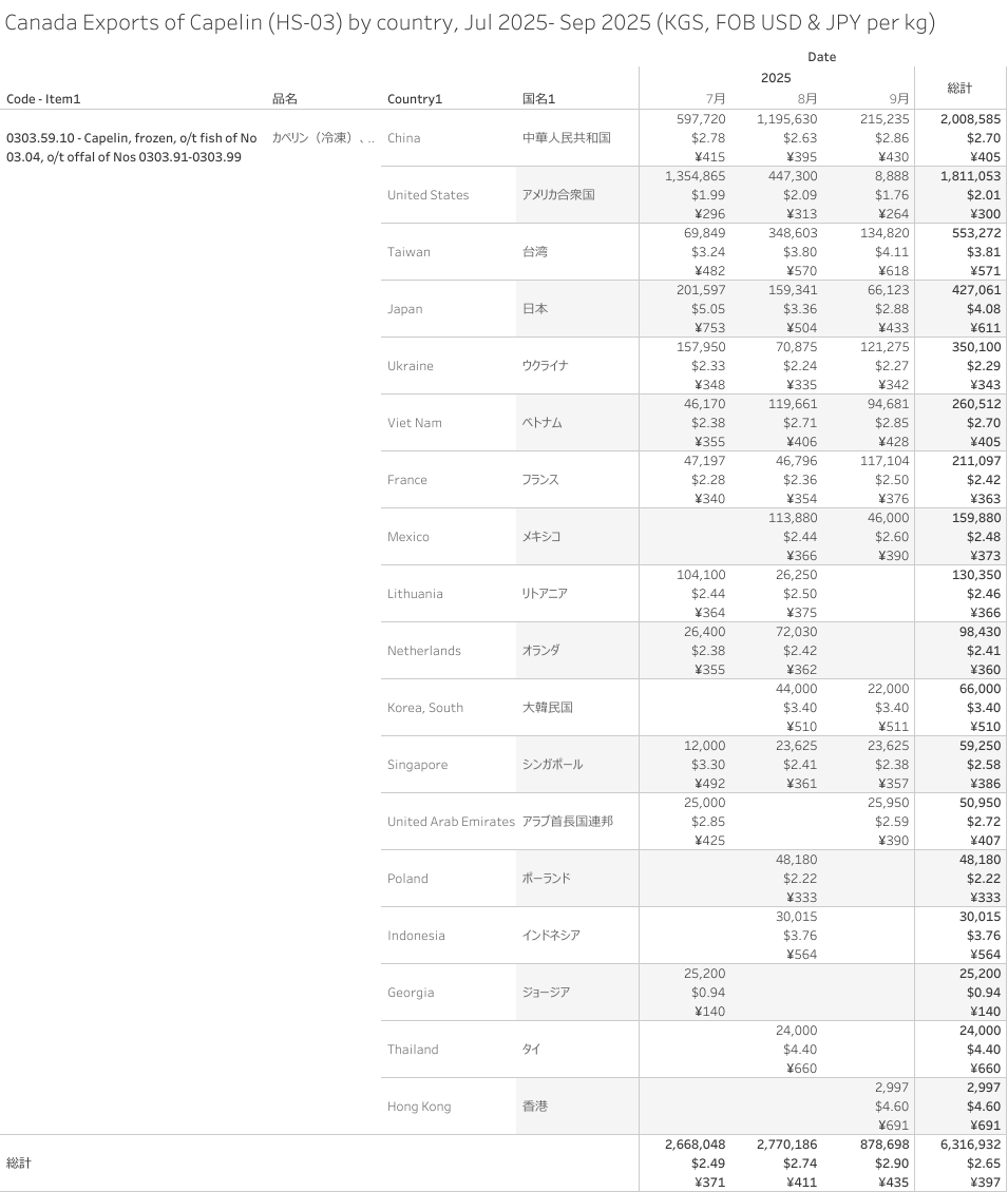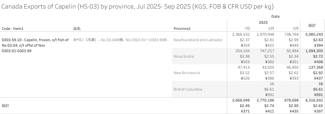 カナダ カラフトシシャモ輸出統計 2025年07-09月
