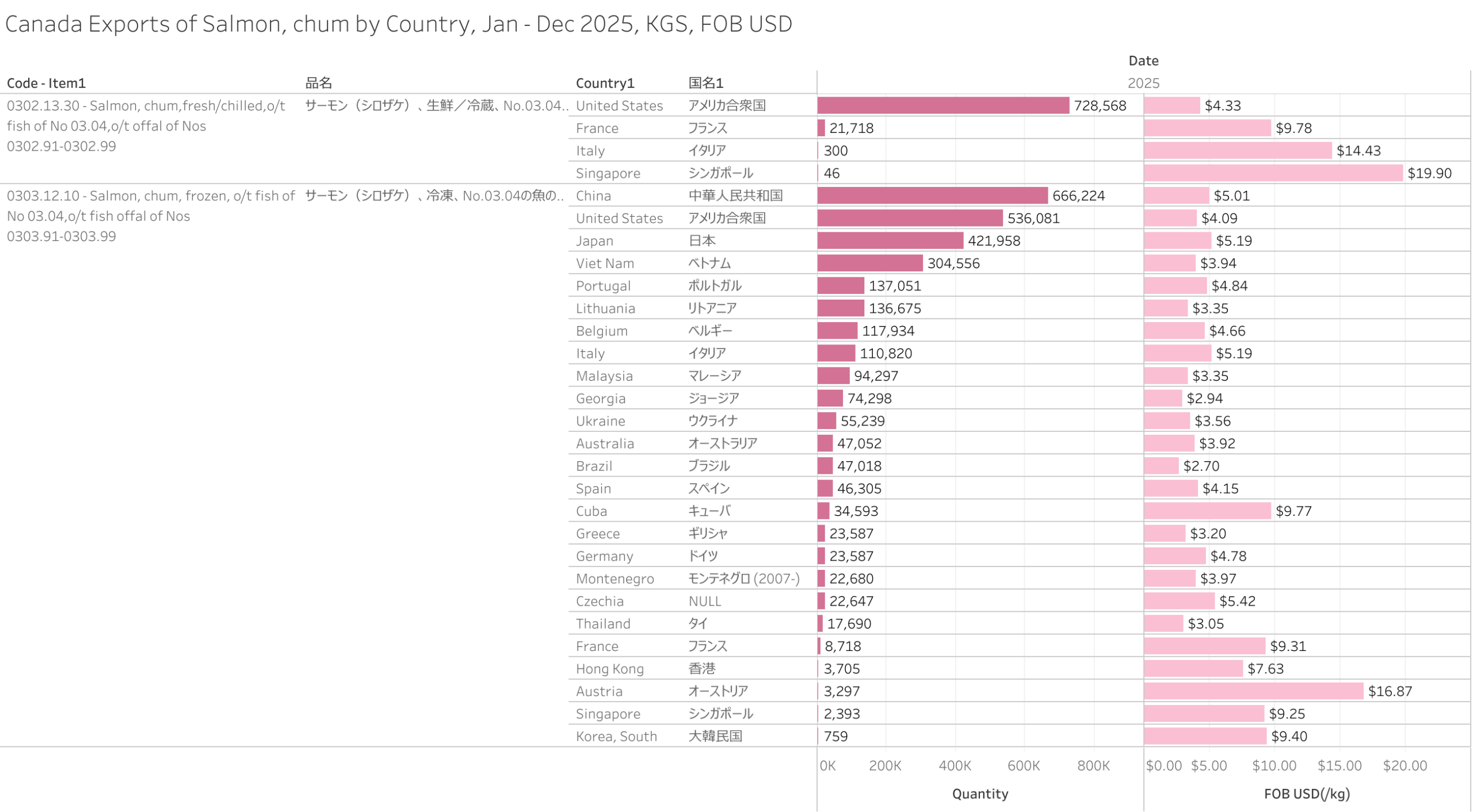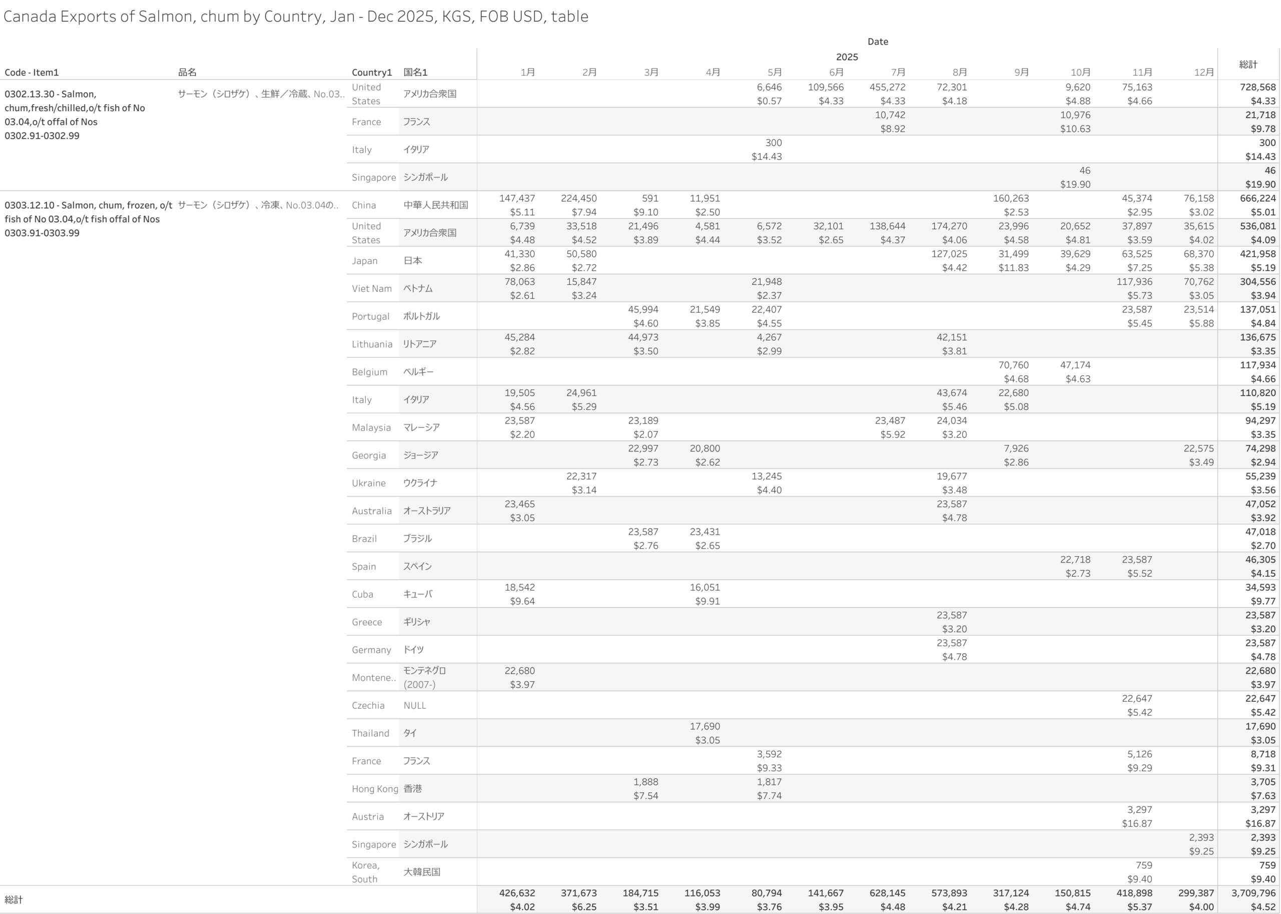 Canada Exports of Salmon, chum (HS-03) Jan - Dec 2025