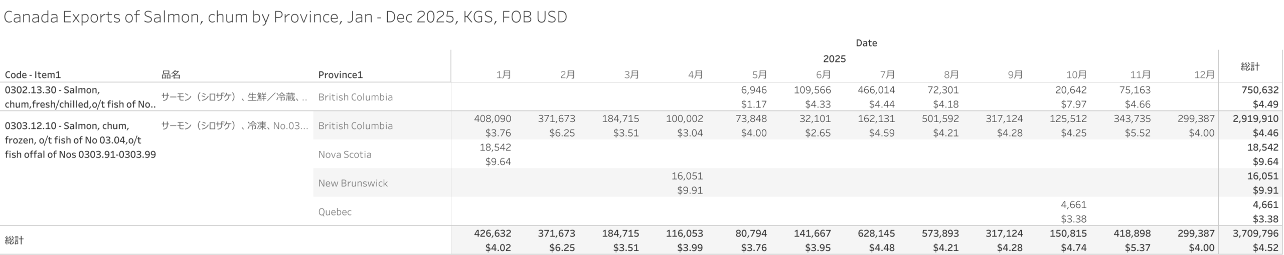 カナダ サーモン(シロザケ)(HS-03)輸出統計 2025年12月まで