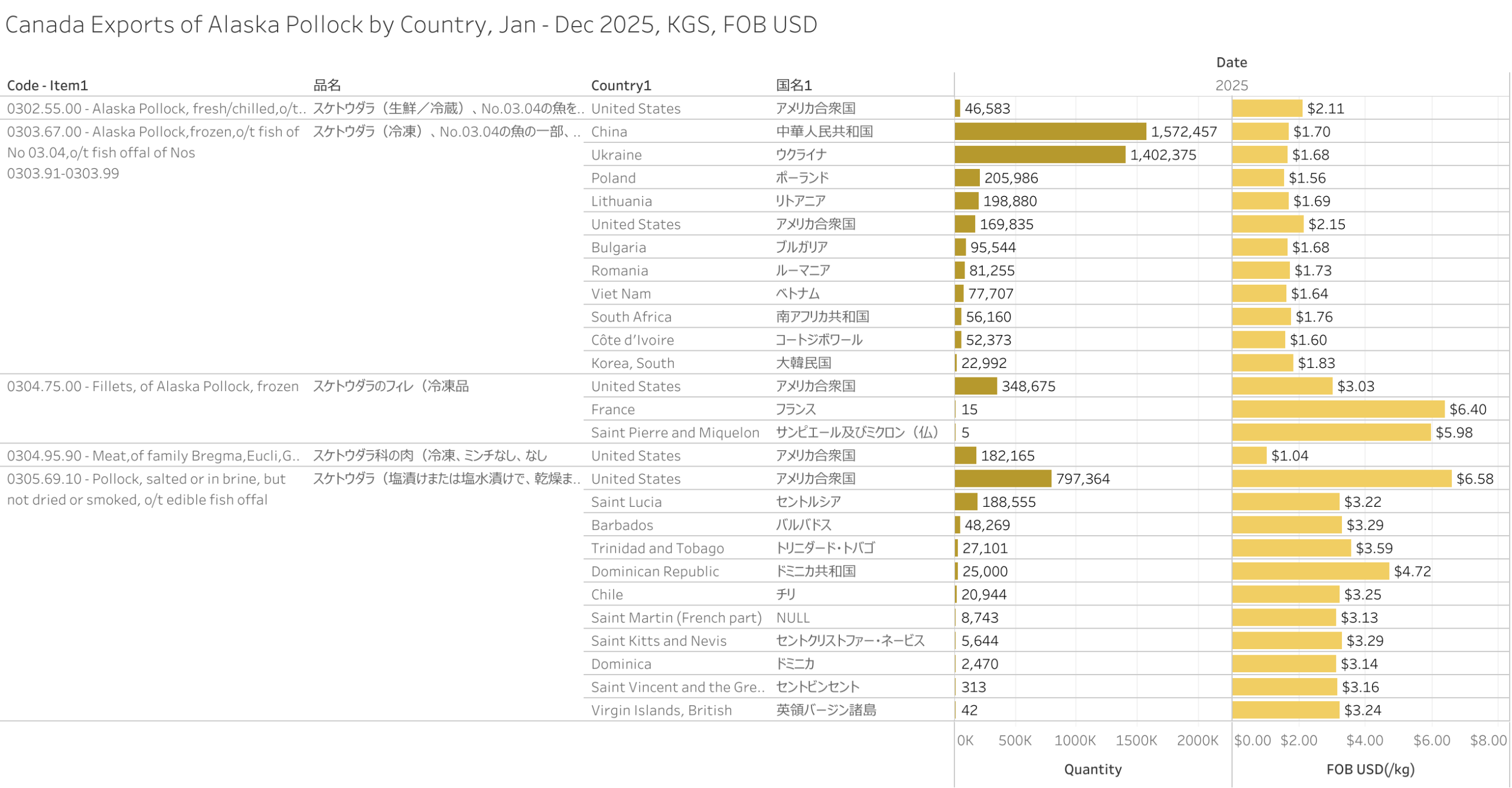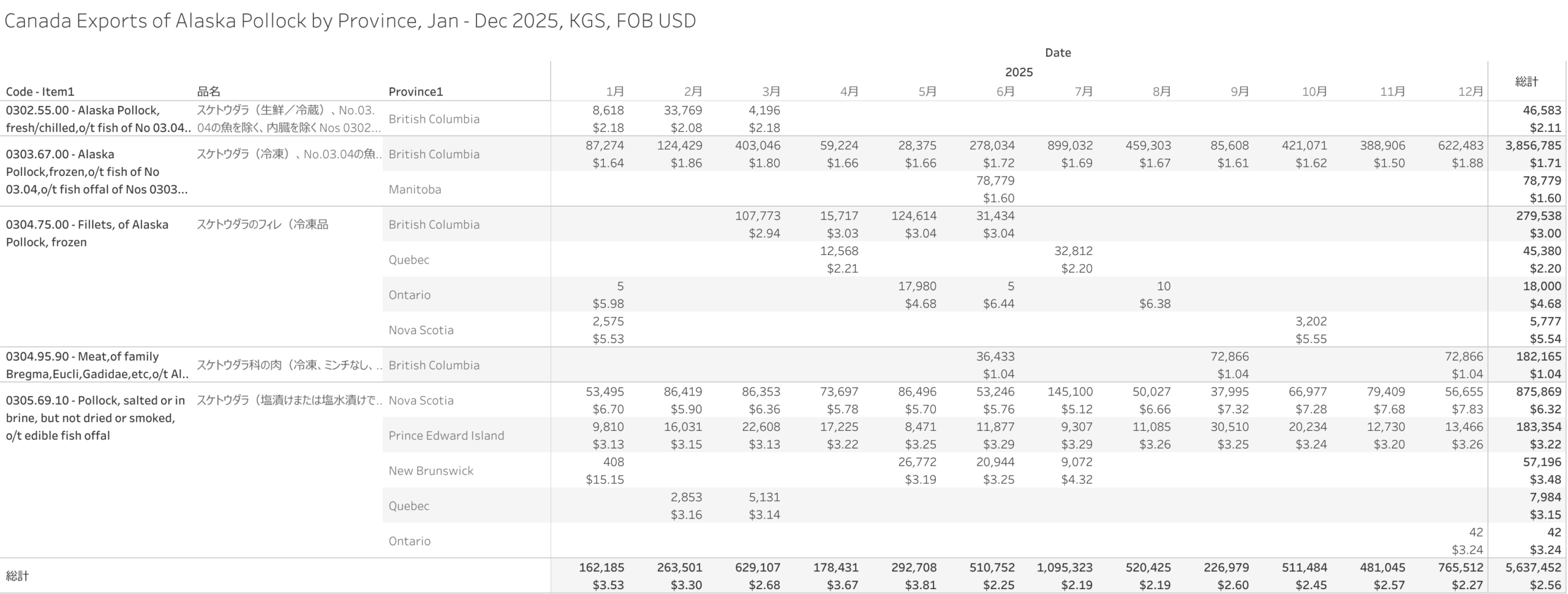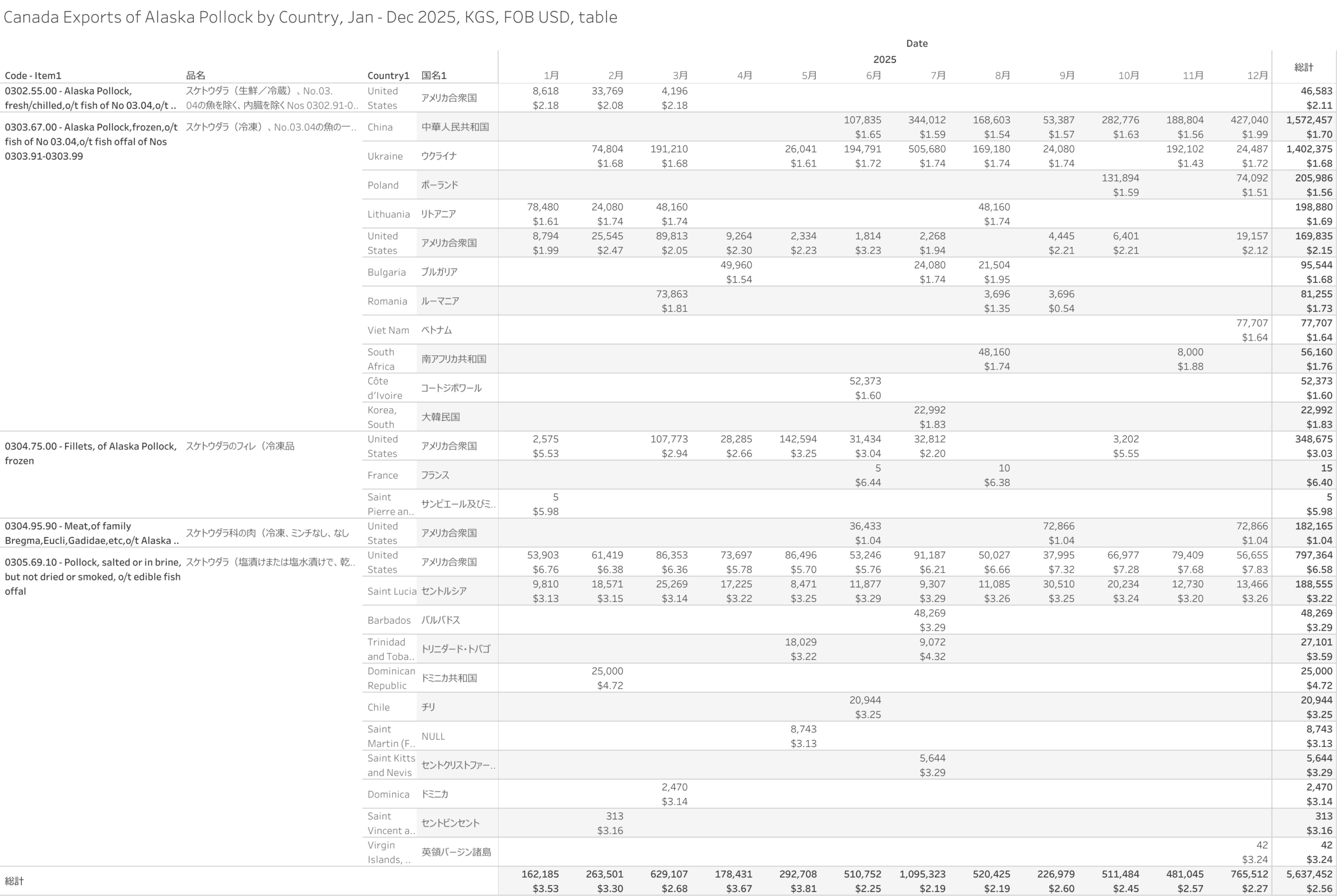 Canada Exports of Alaska Pollock (HS-03) Jan - Dec 2025