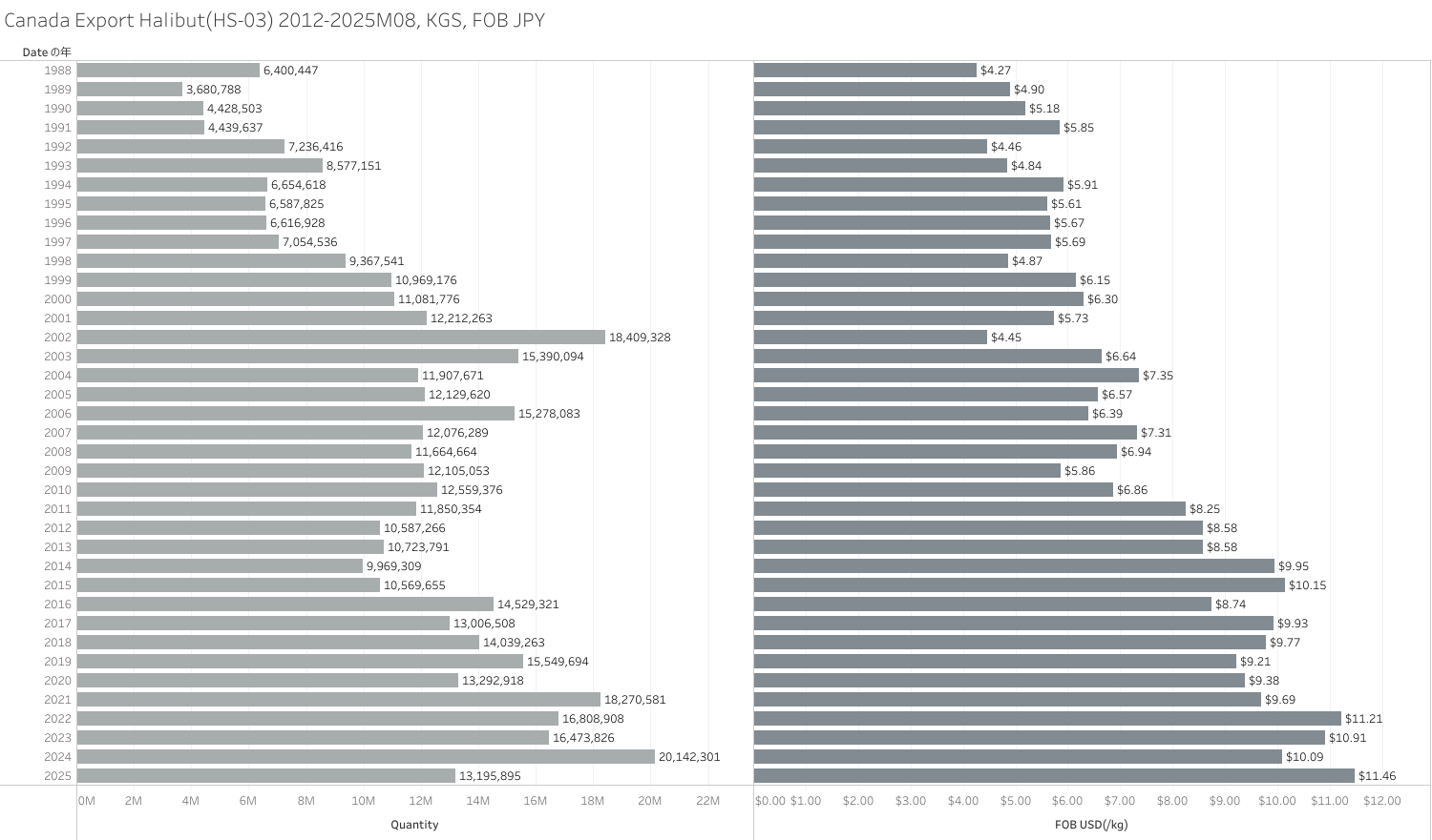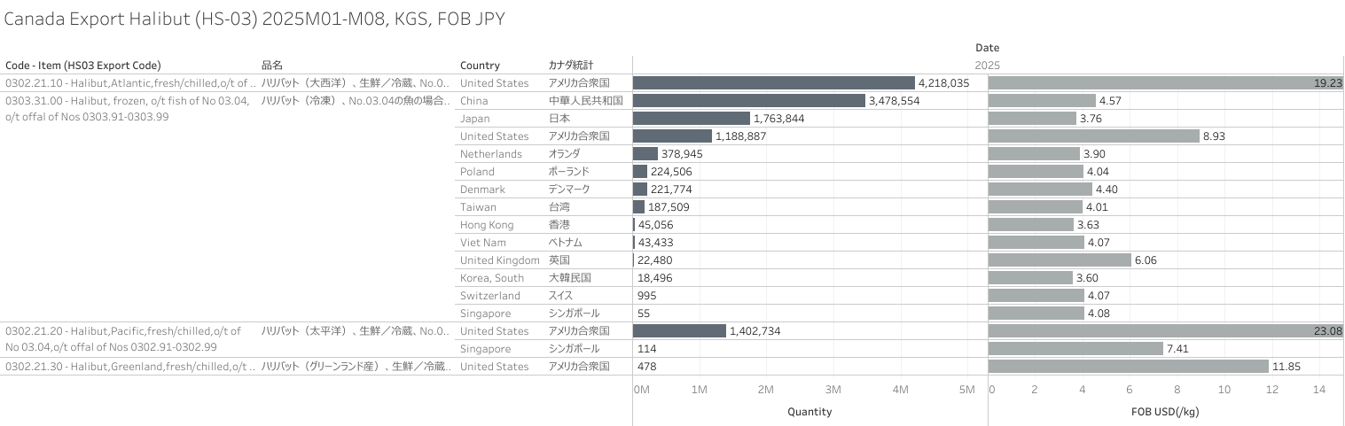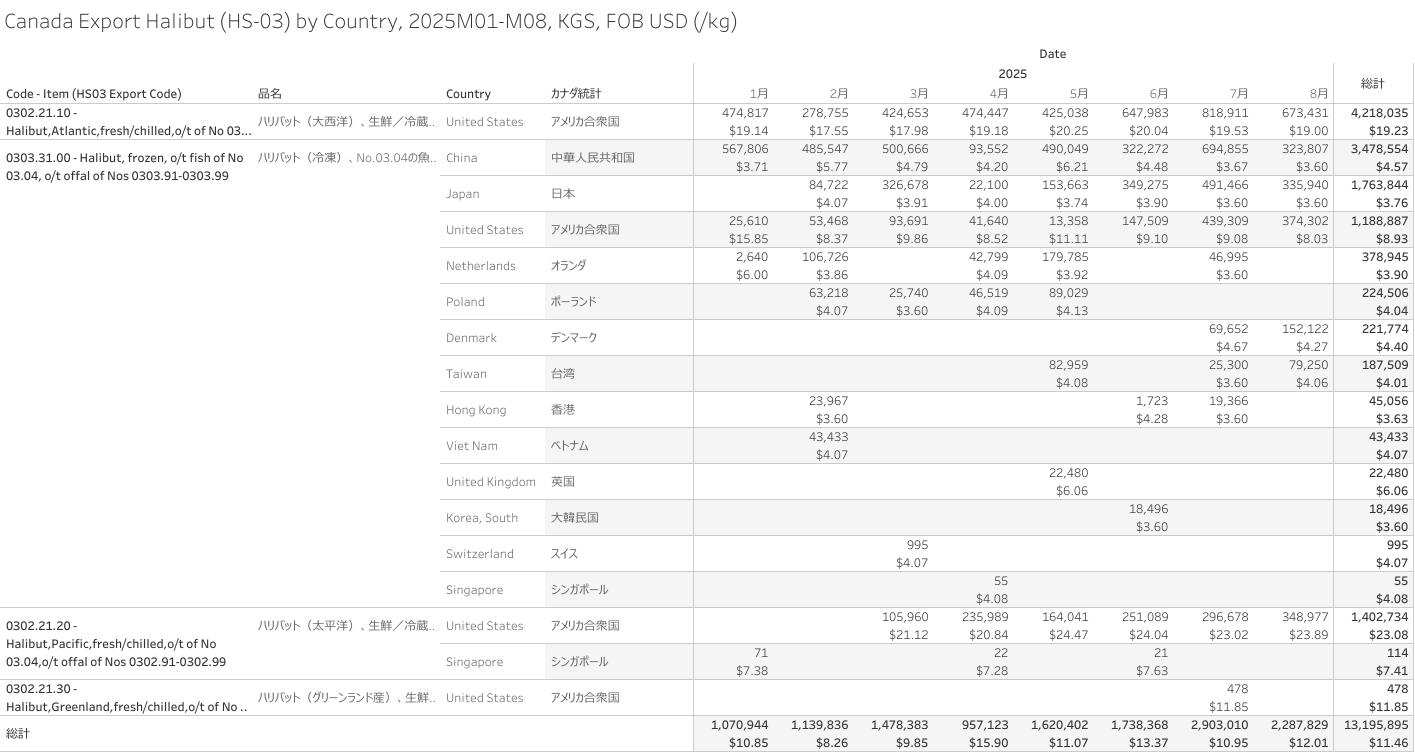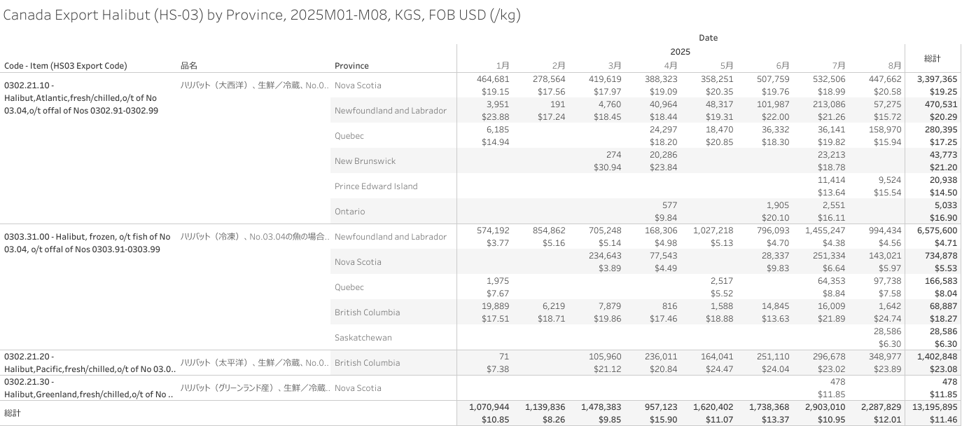カナダ ハリバット(HS-03)輸出統計 2025年08月まで