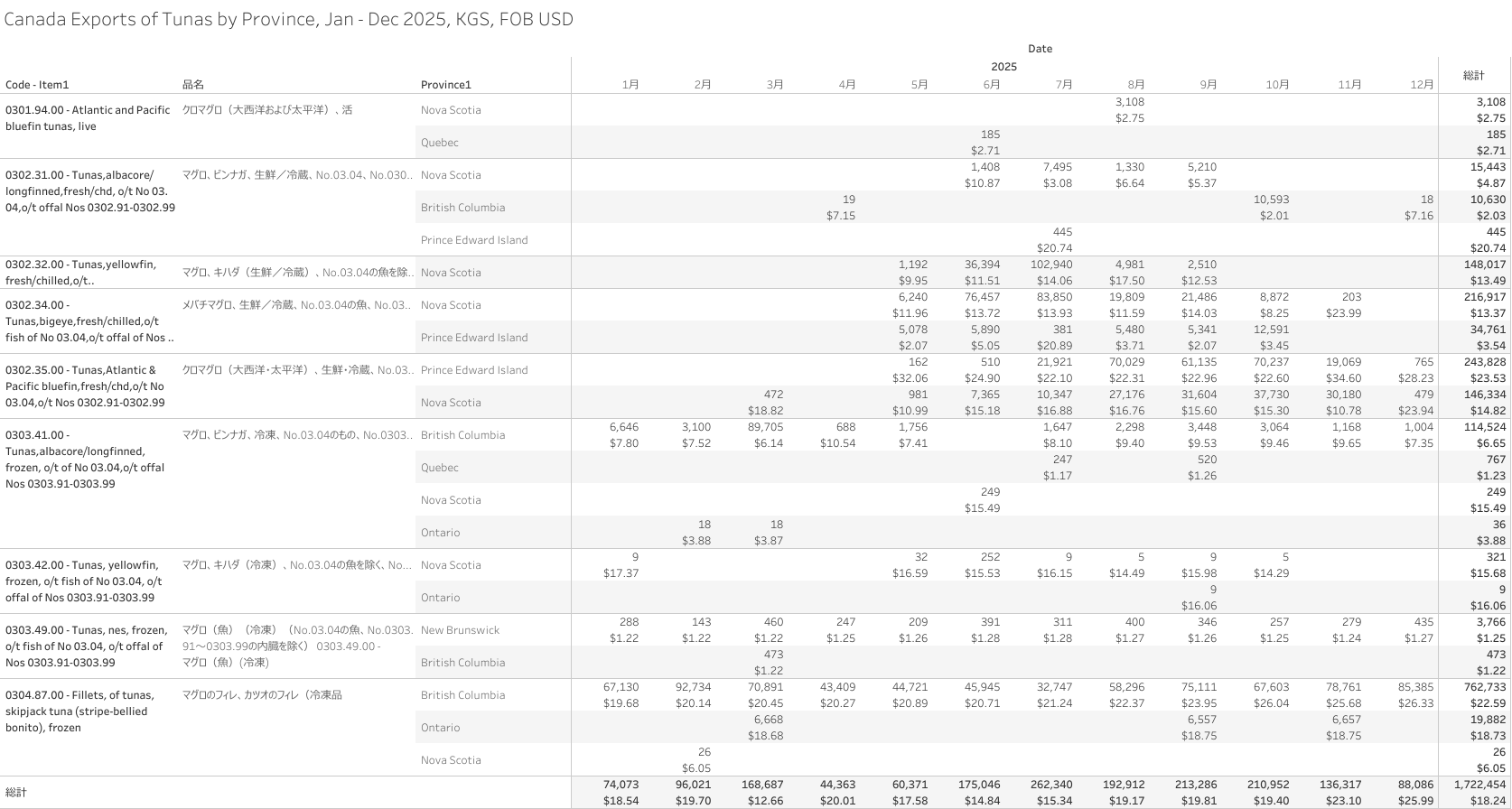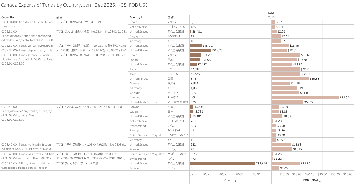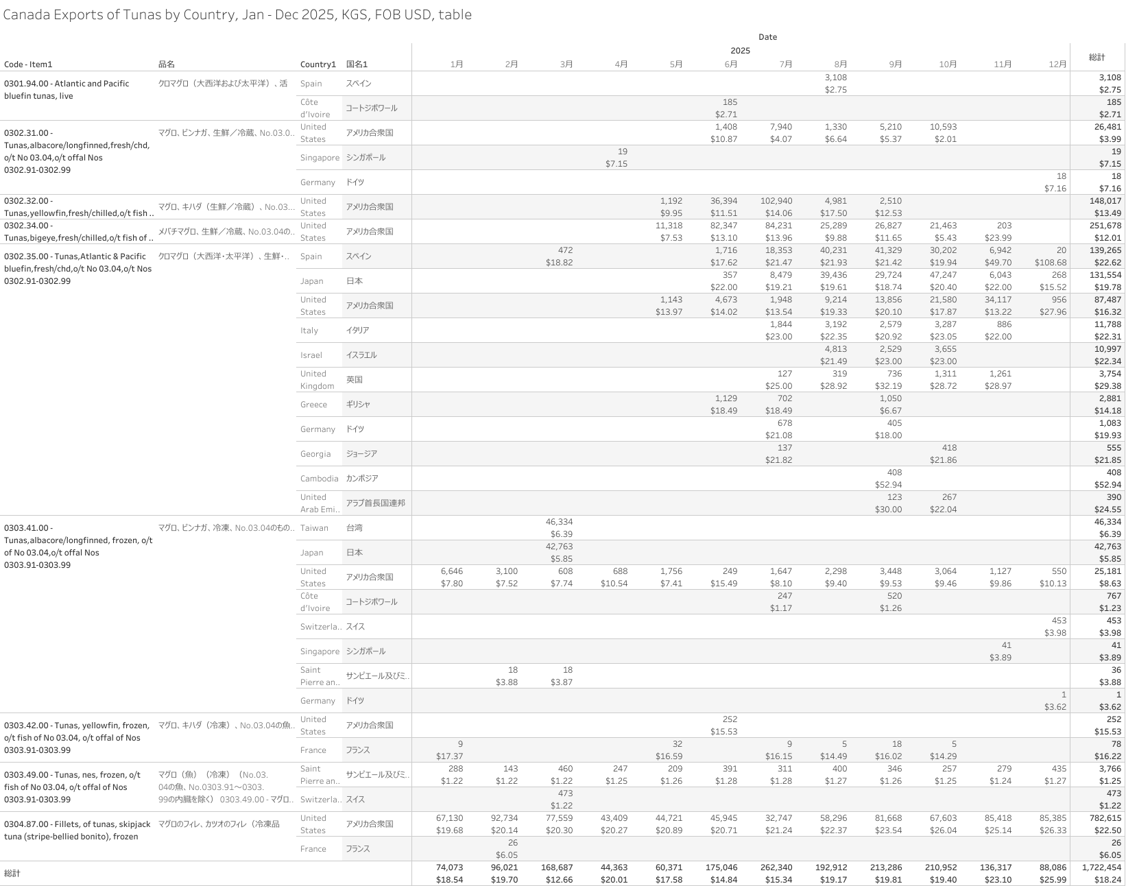 カナダ マグロ類(HS-03)輸出統計 2025年12月まで