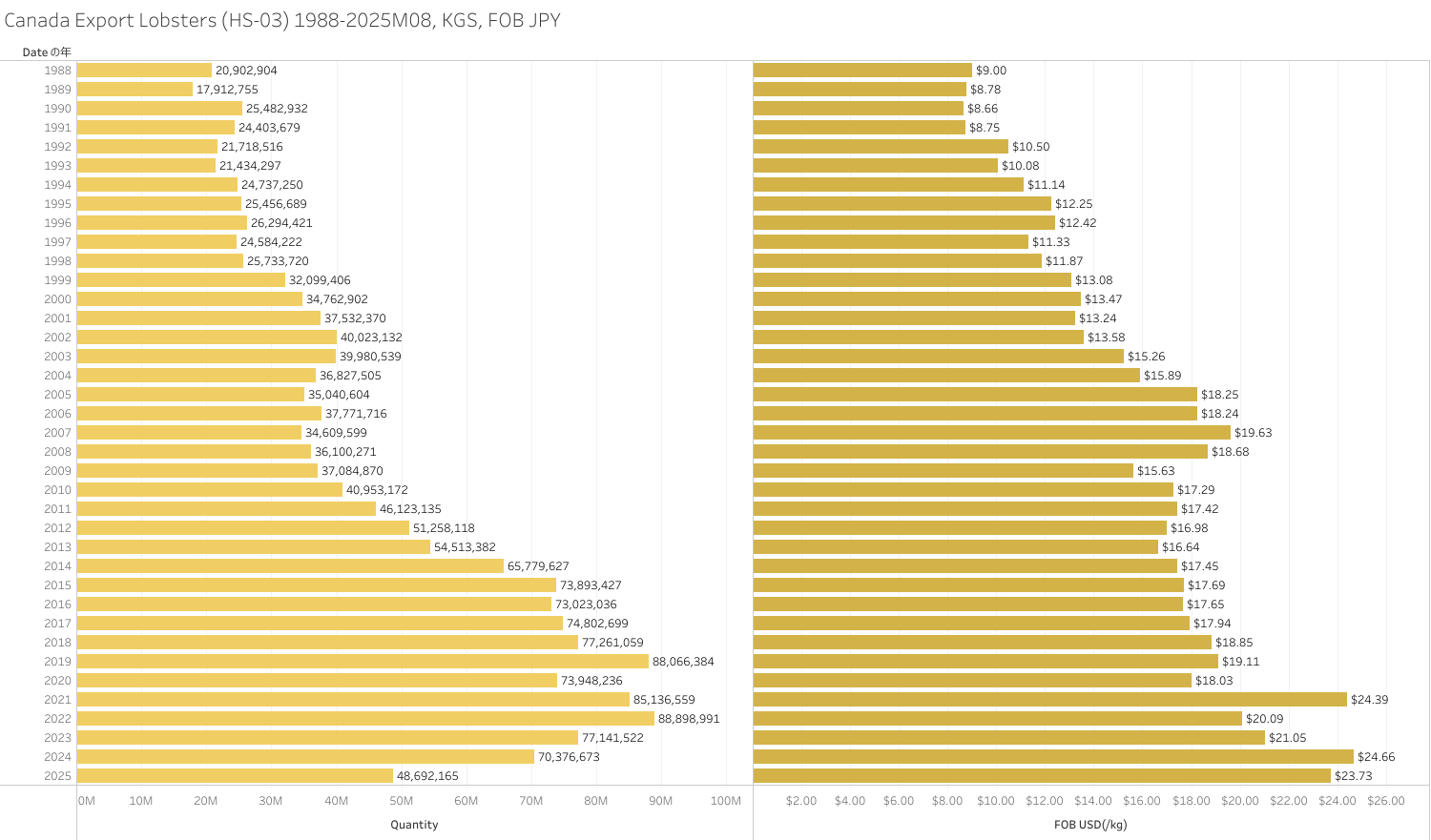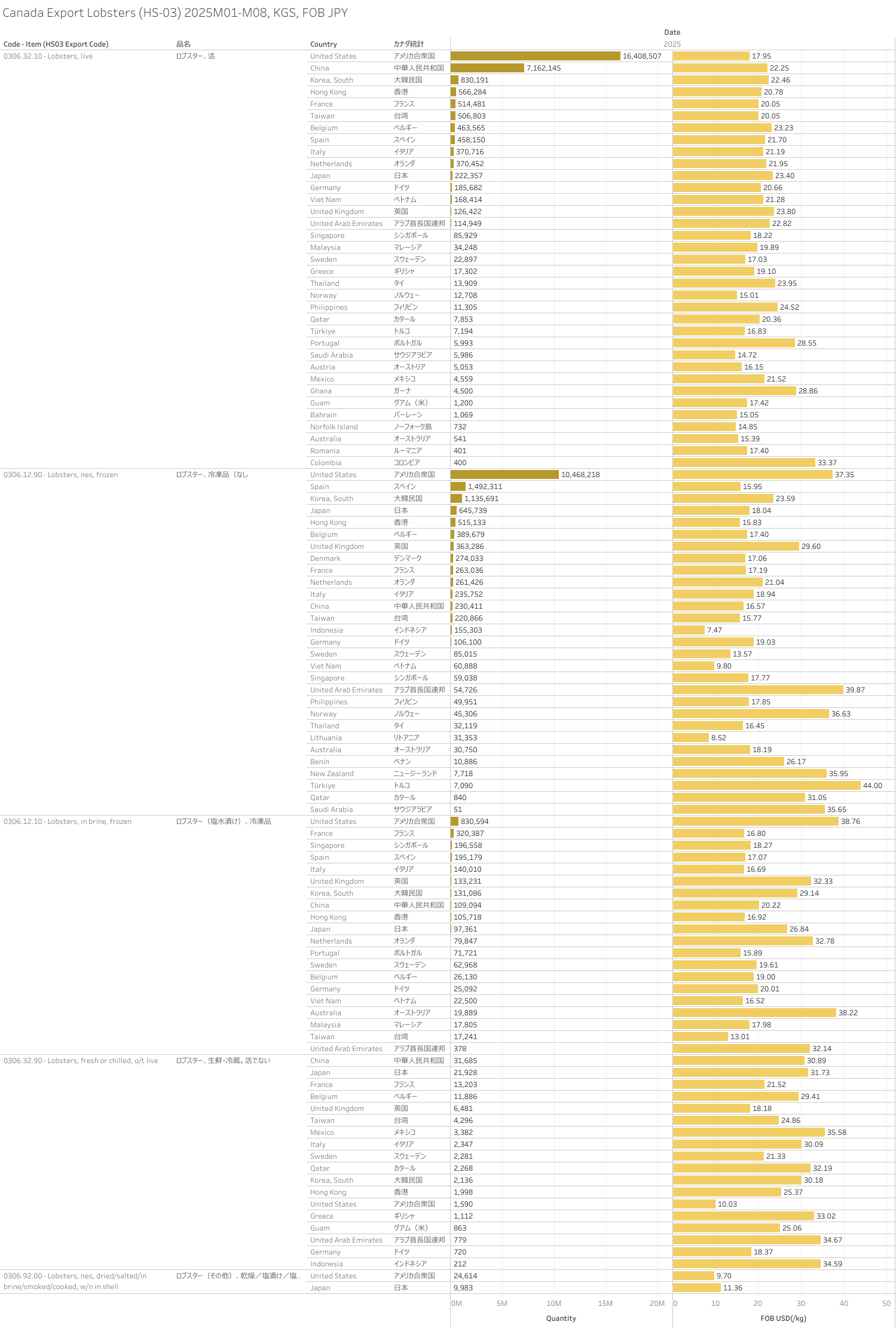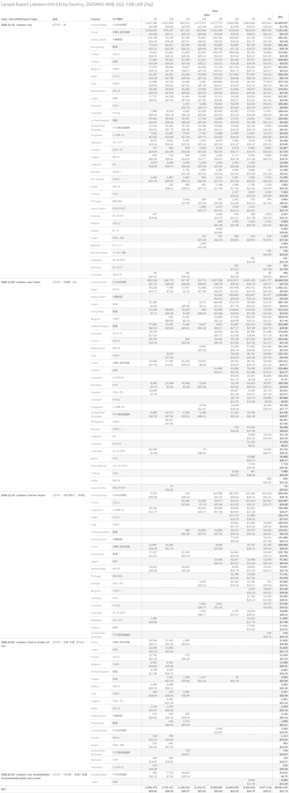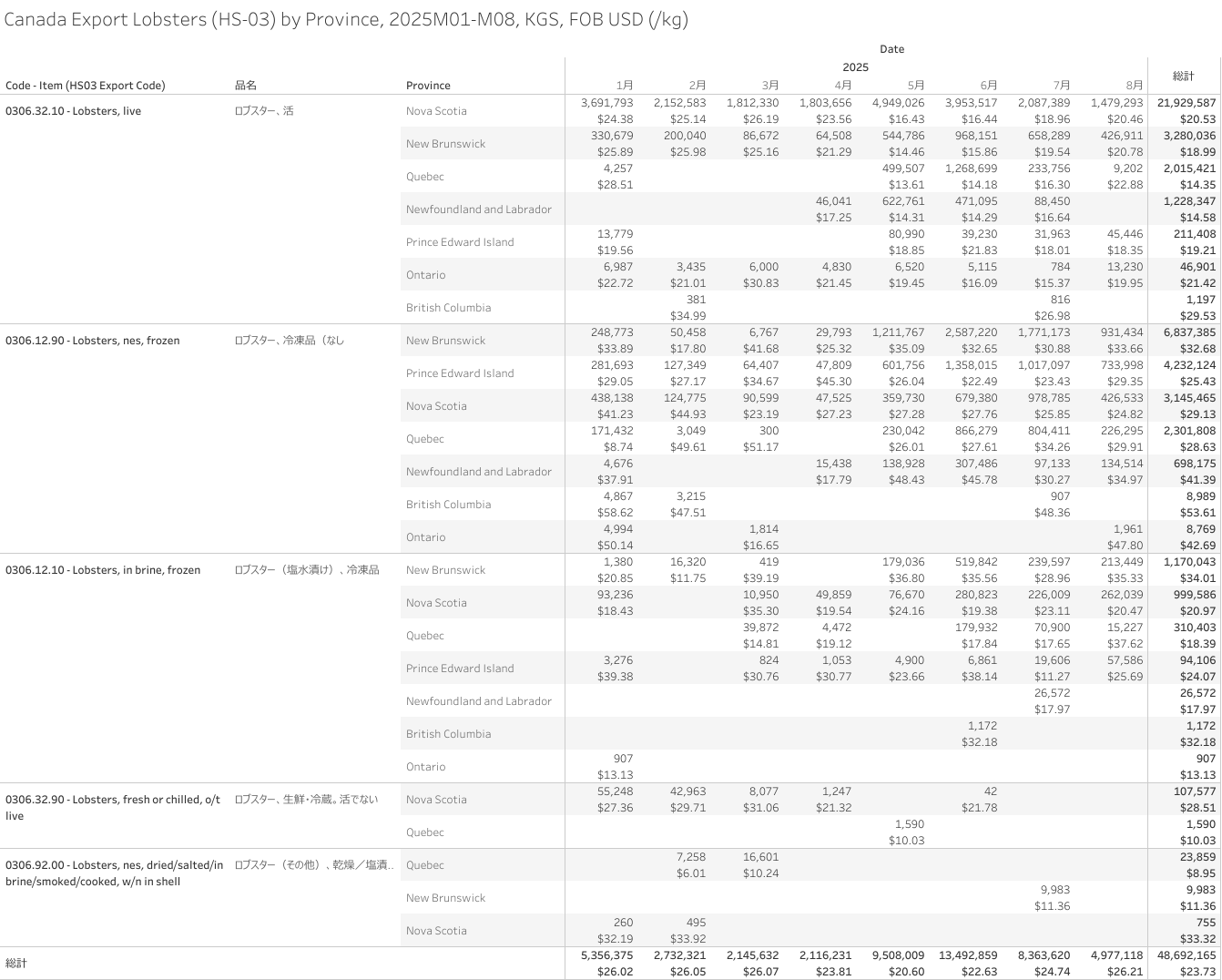 カナダ ロブスター(HS-03)輸出統計 2025年08月まで