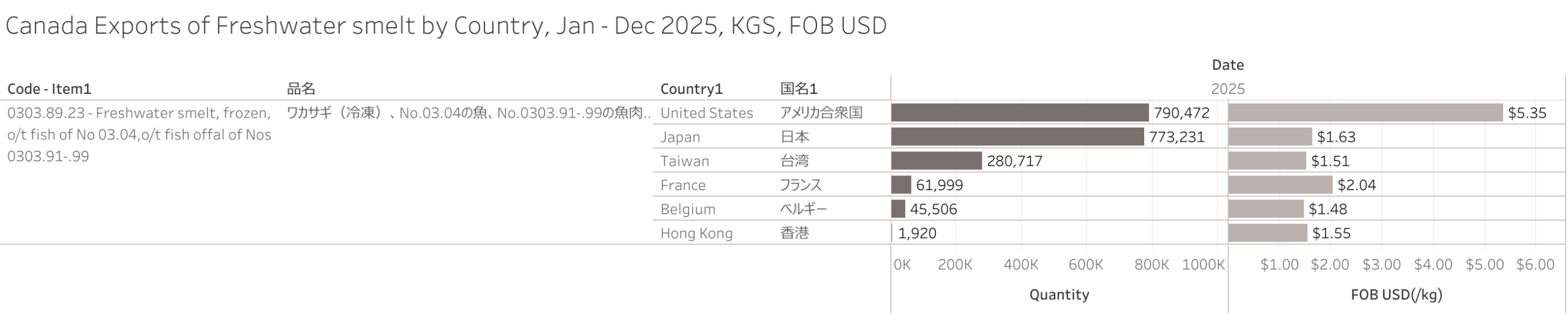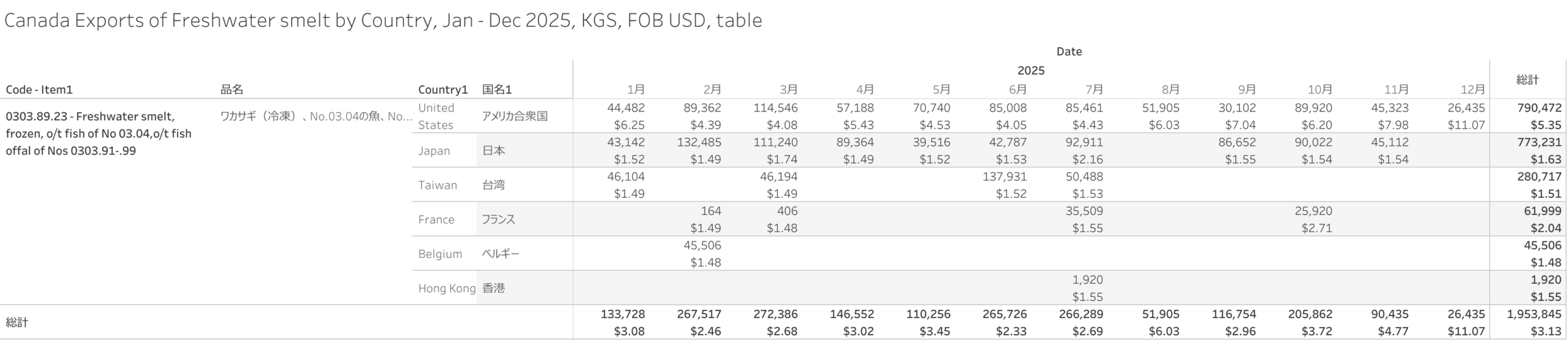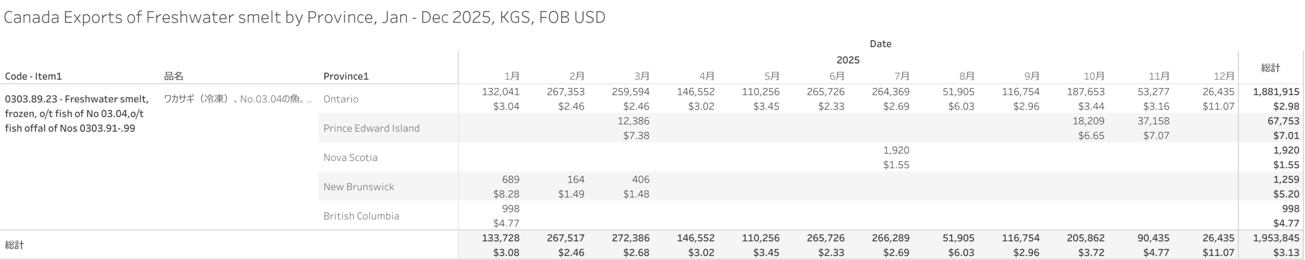 カナダ ワカサギ(HS-03)輸出統計 2025年12月まで