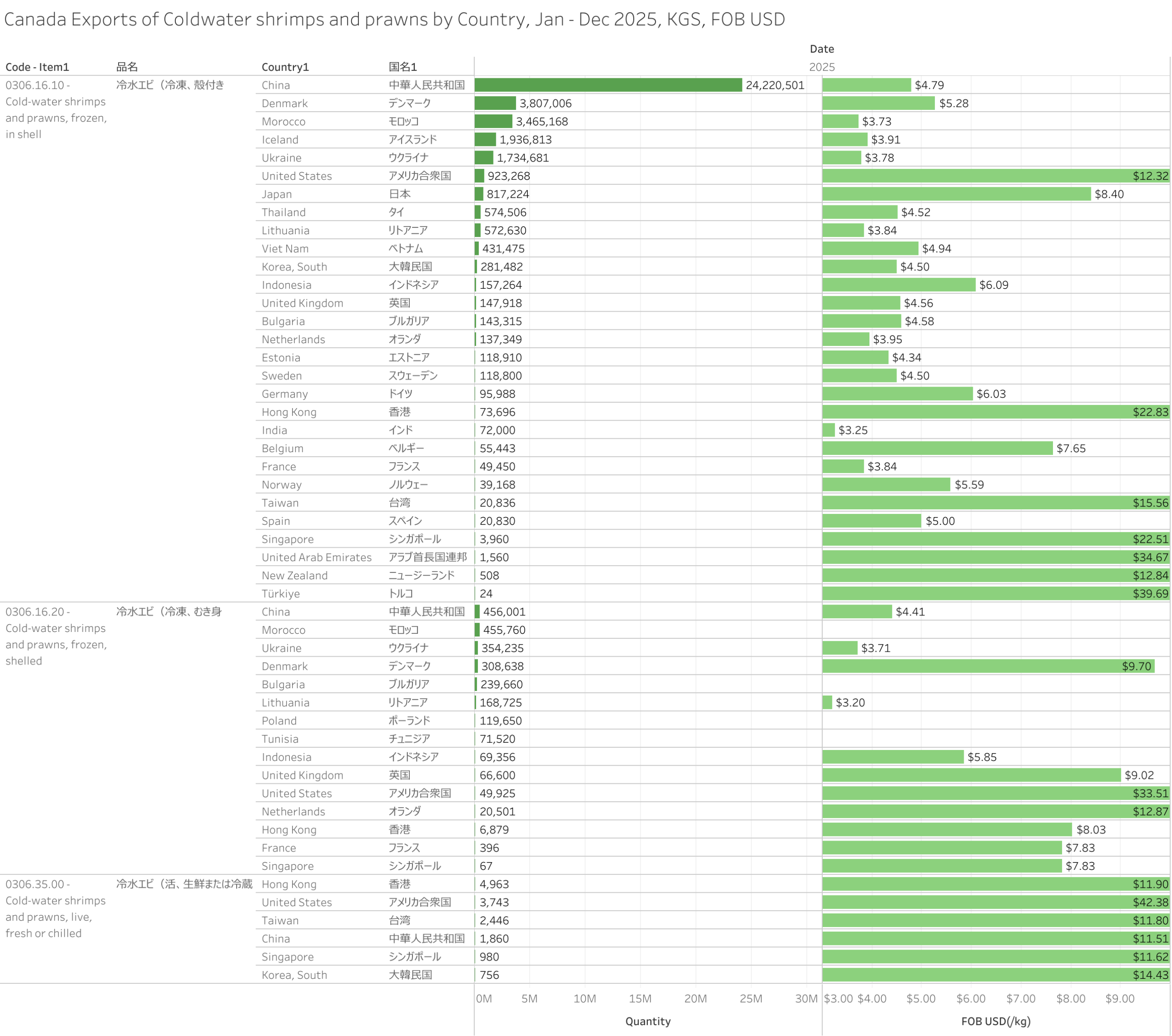 Canada Exports of Coldwater shrimps and prawns (HS-03) Jan - Dec 2025