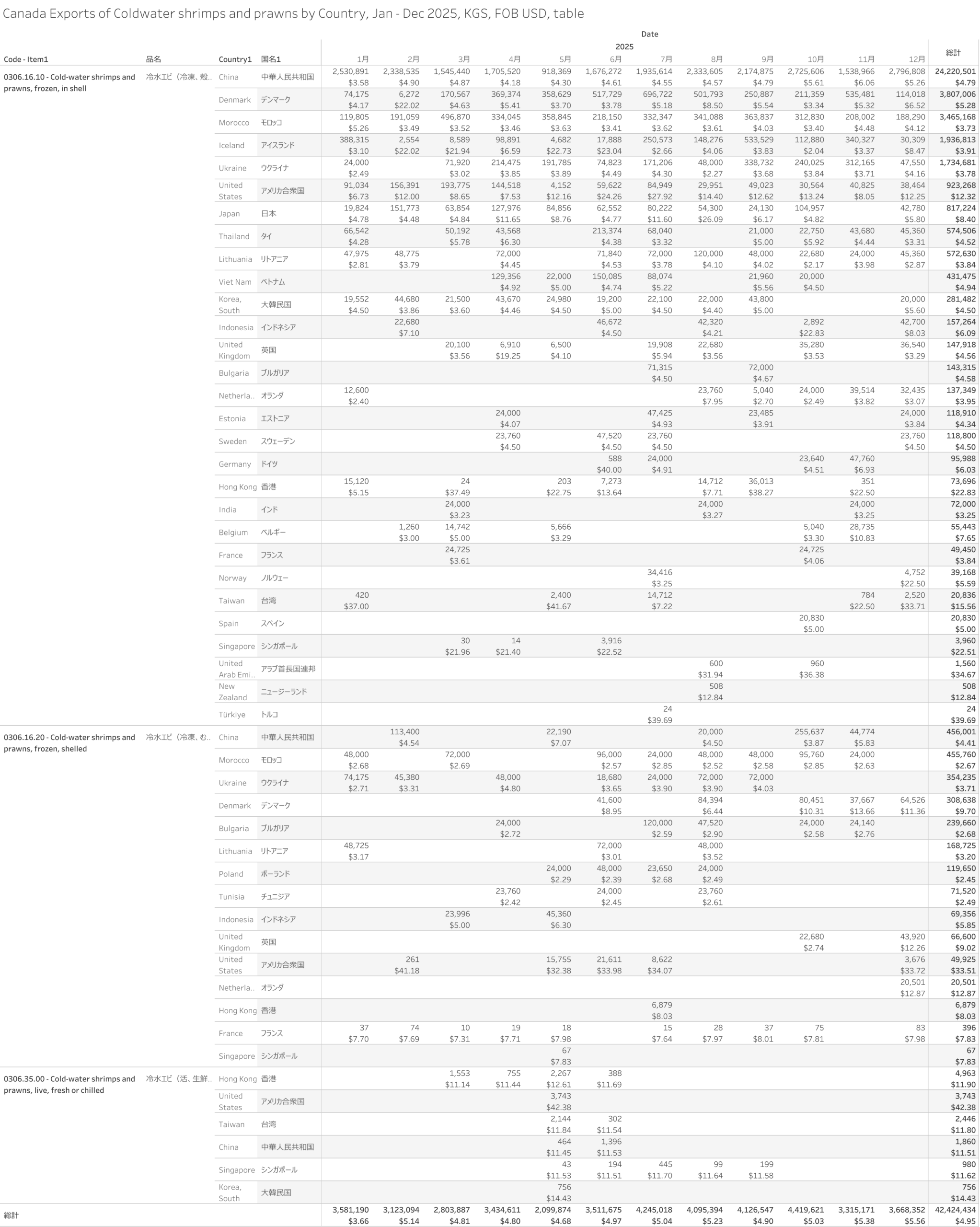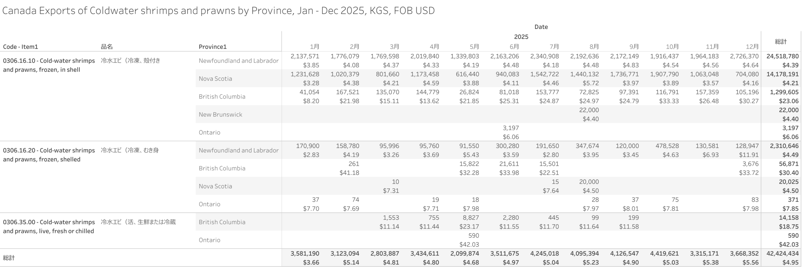 カナダ 冷水性シュリンプ及びプローン(HS-03)輸出統計 2025年12月まで