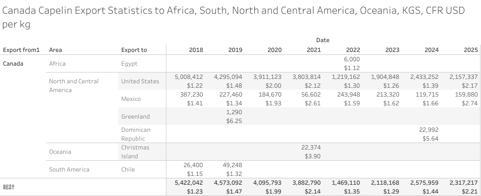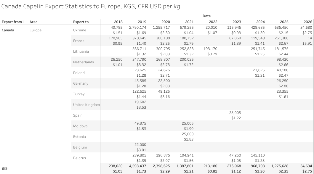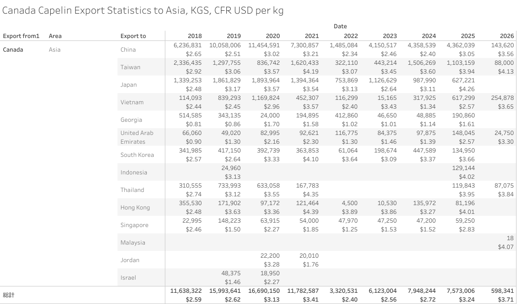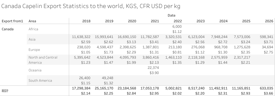 カナダからのカラフトシシャモ輸出統計 2018-2026年2月