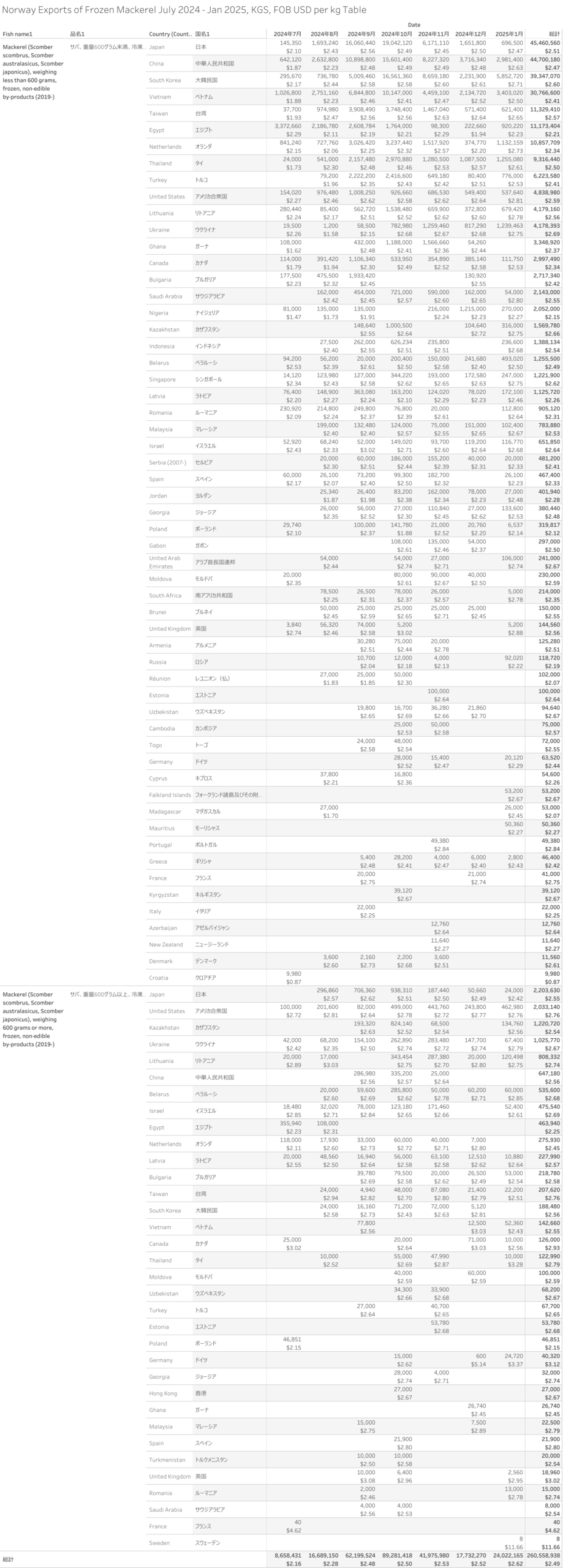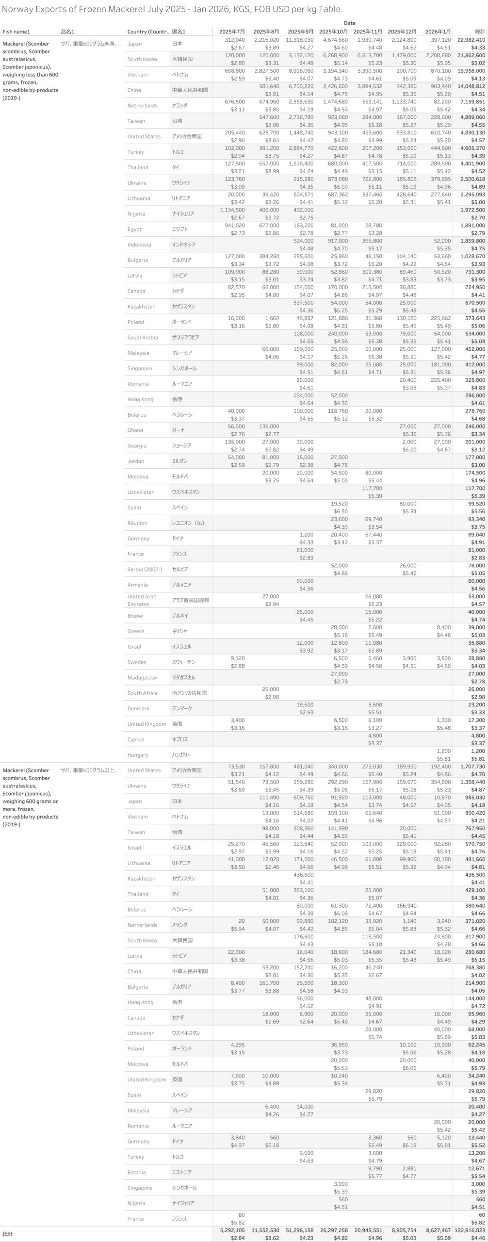 ノルウェー サバ 輸出統計 2025年07月から2026年01月まで