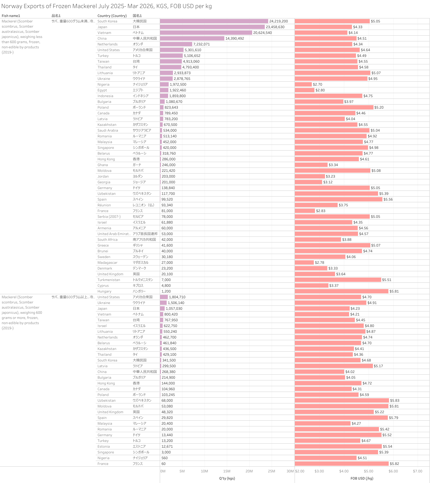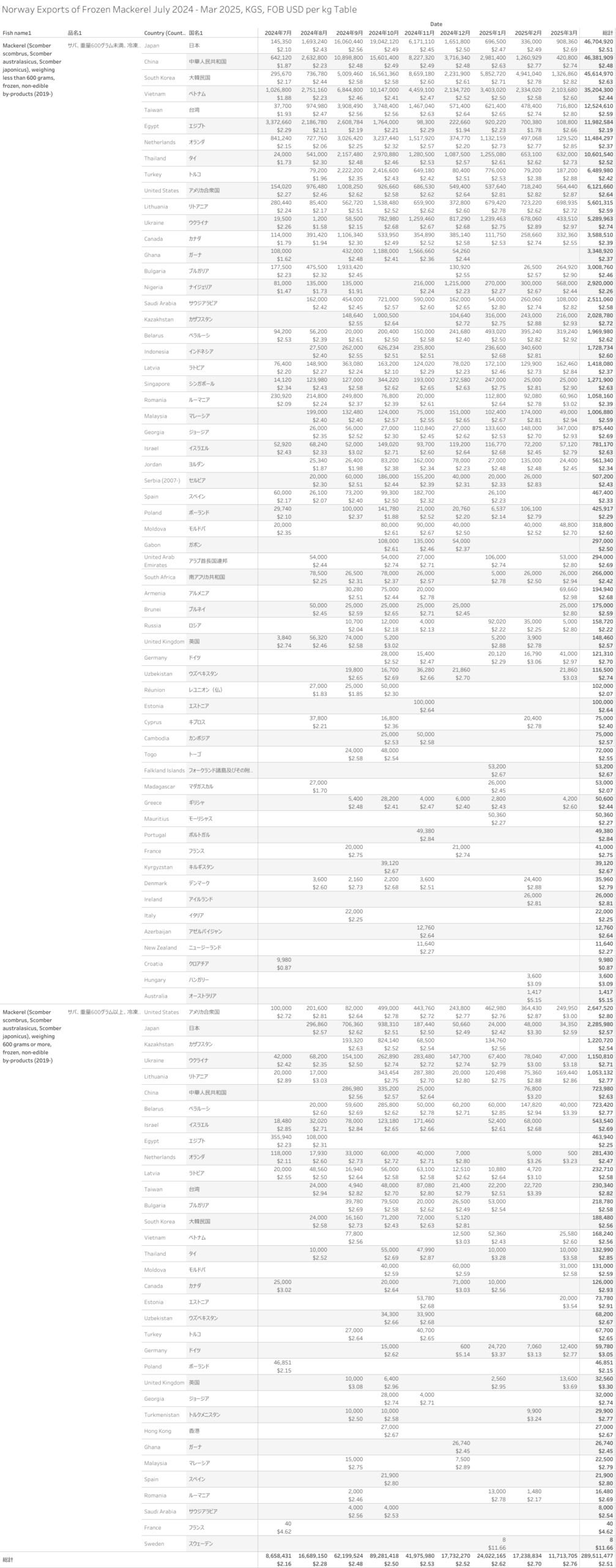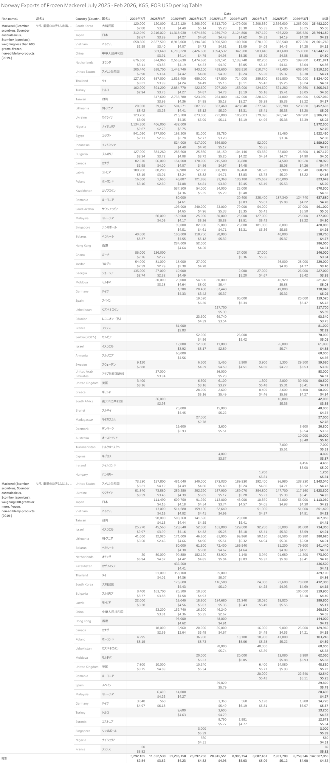 ノルウェー サバ 輸出統計 2025年7月から2026年3月まで