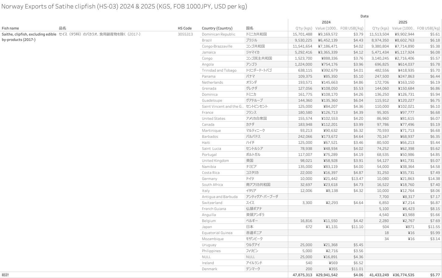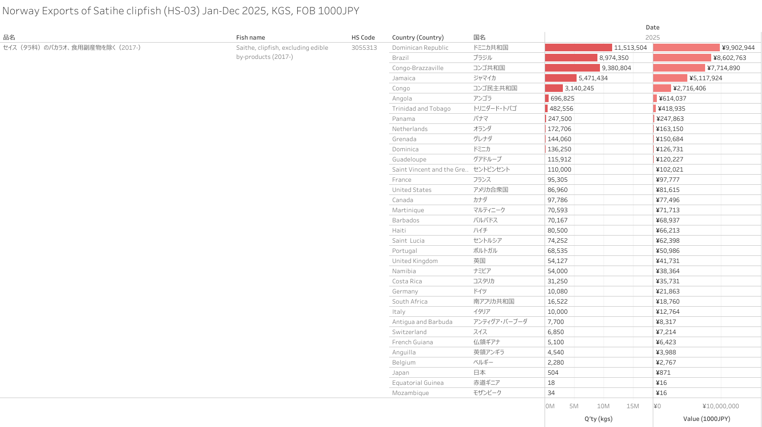 ノルウェー セイスのバカラオ(HS-03)輸出統計 2025年01-12月