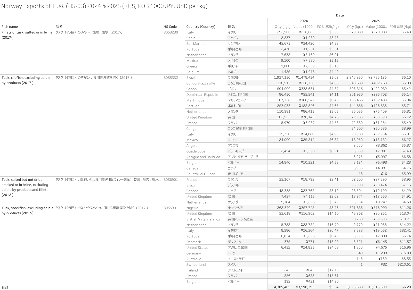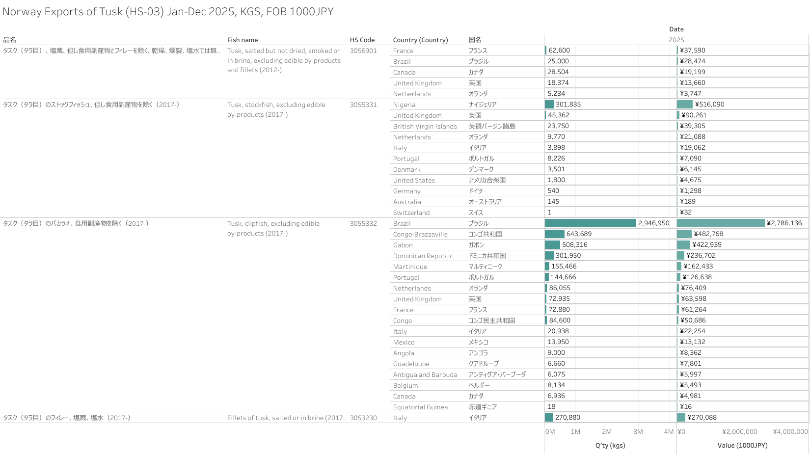 ノルウェー タスク(HS-03)輸出統計 2025年01-12月