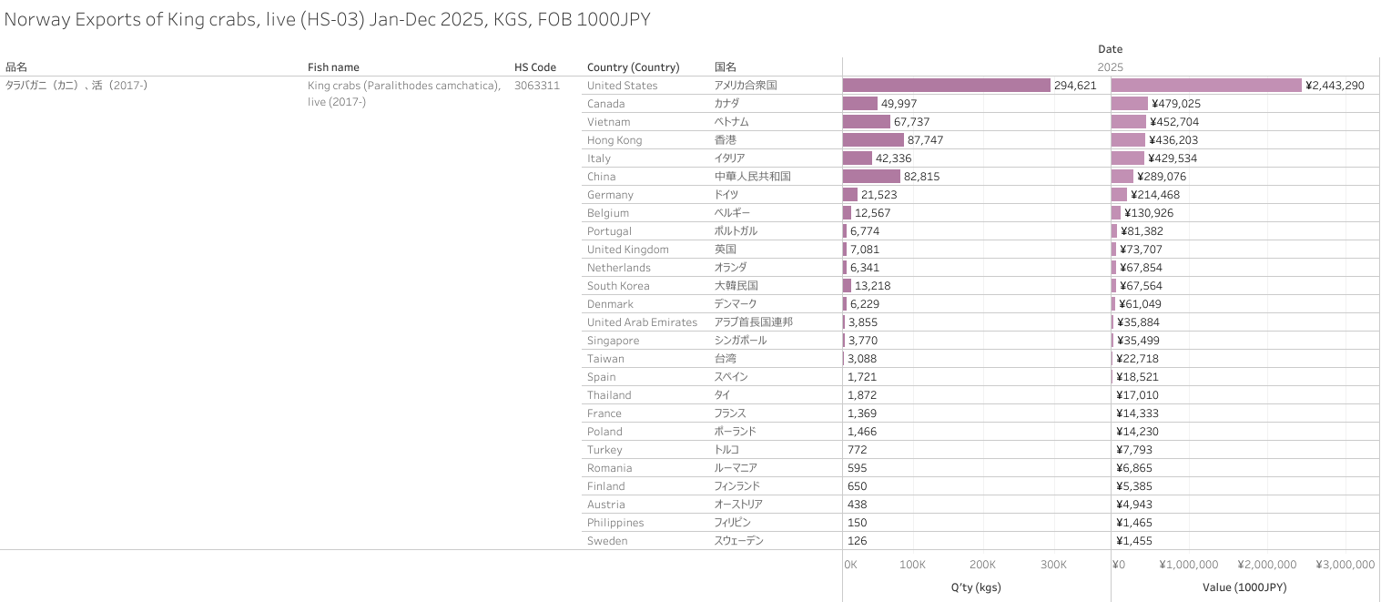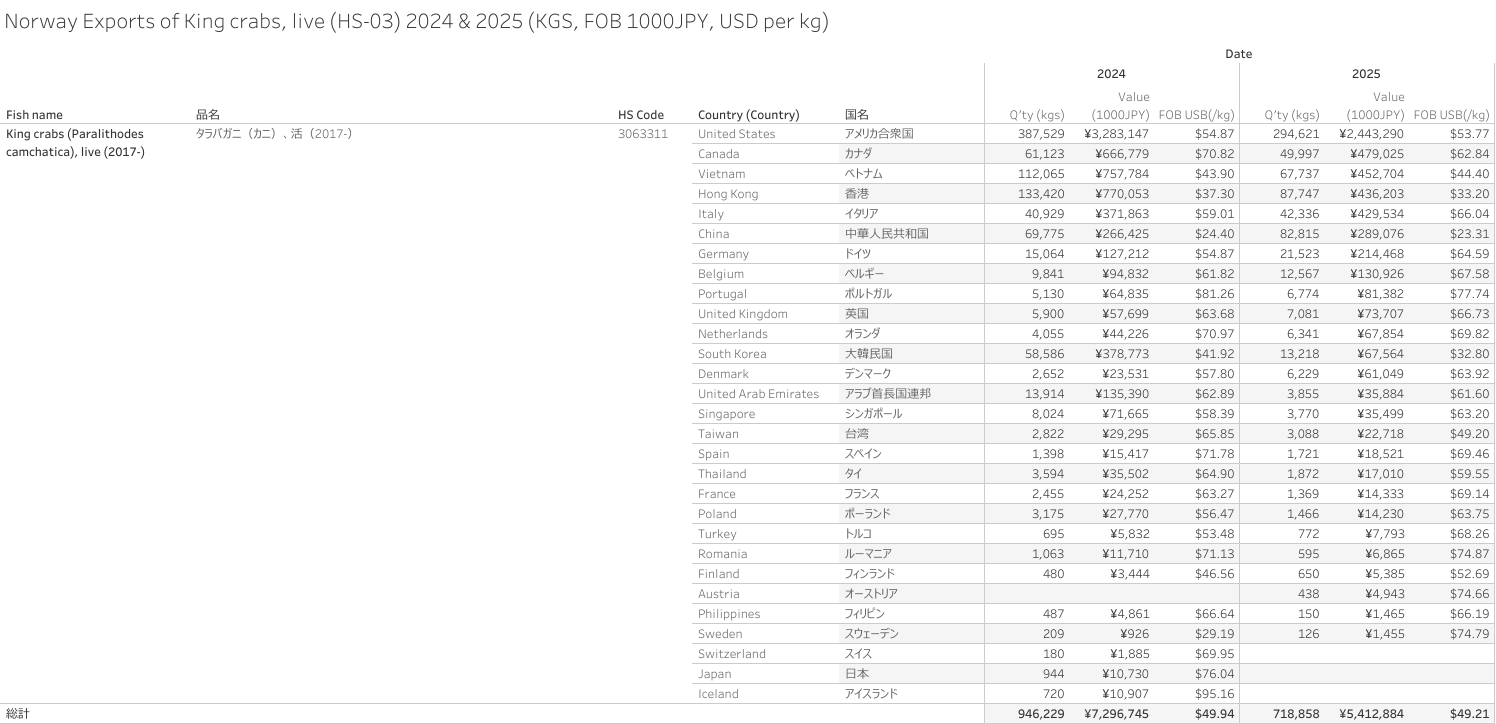 ノルウェー タラバガニ、活(HS-03)輸出統計 2025年01-12月