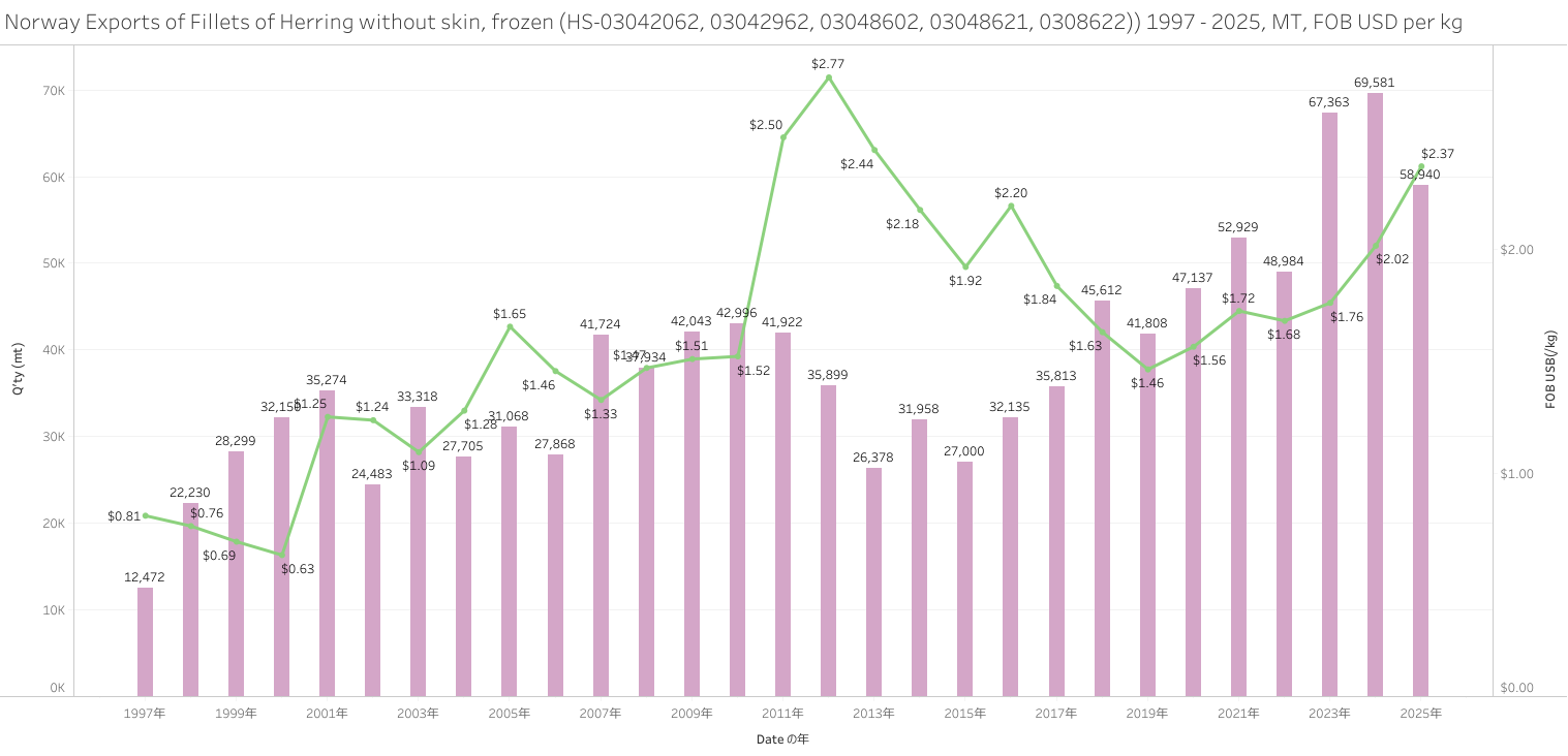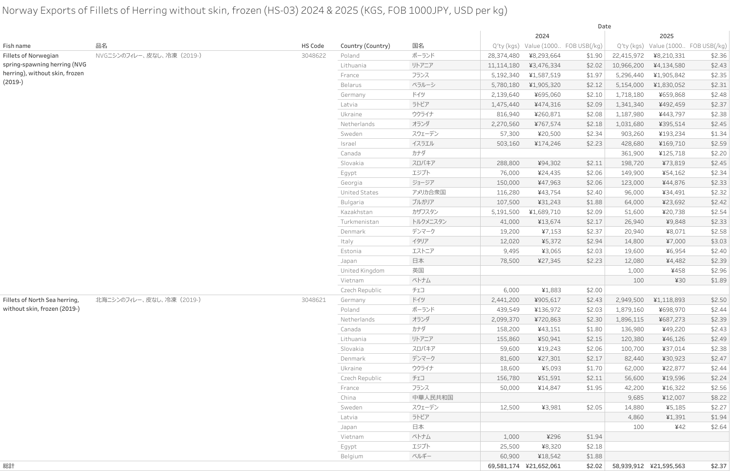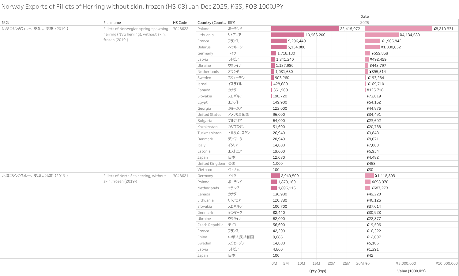 ノルウェー ニシンのフィレー、皮なし、冷凍(HS-03)輸出統計 2025年01-12月