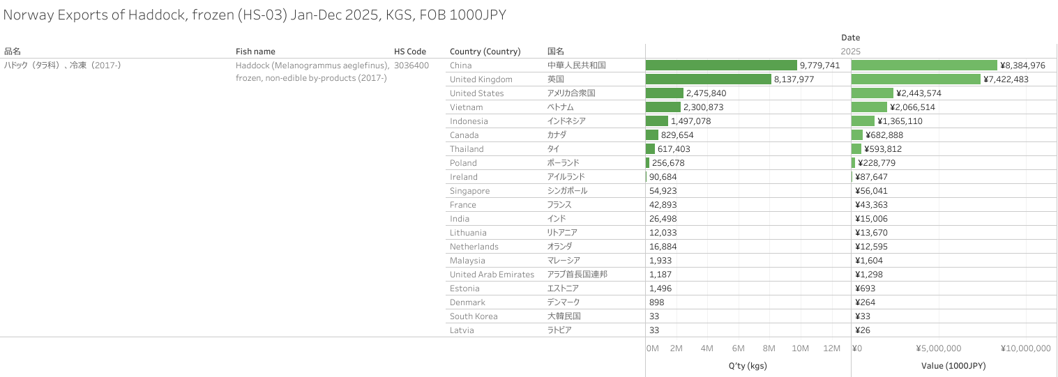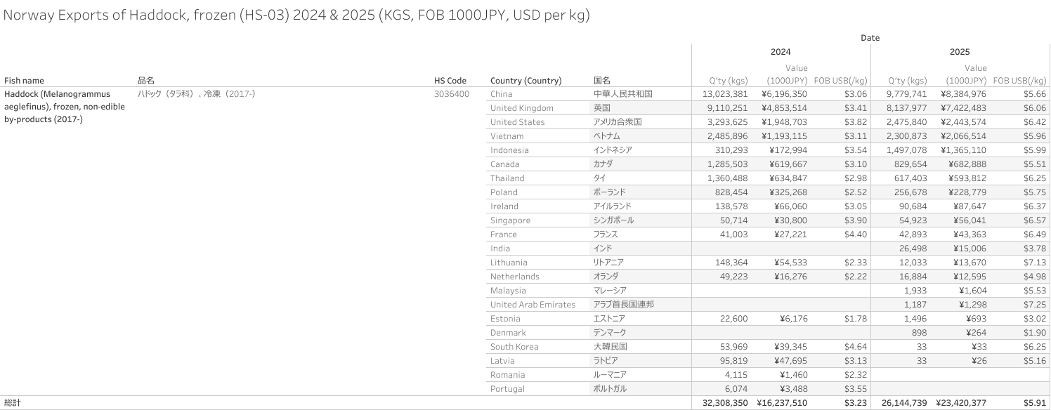 ノルウェー ハドック、冷凍(HS-03)輸出統計 2025年01-12月