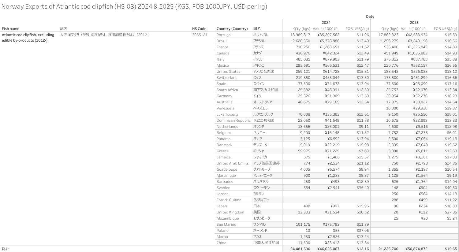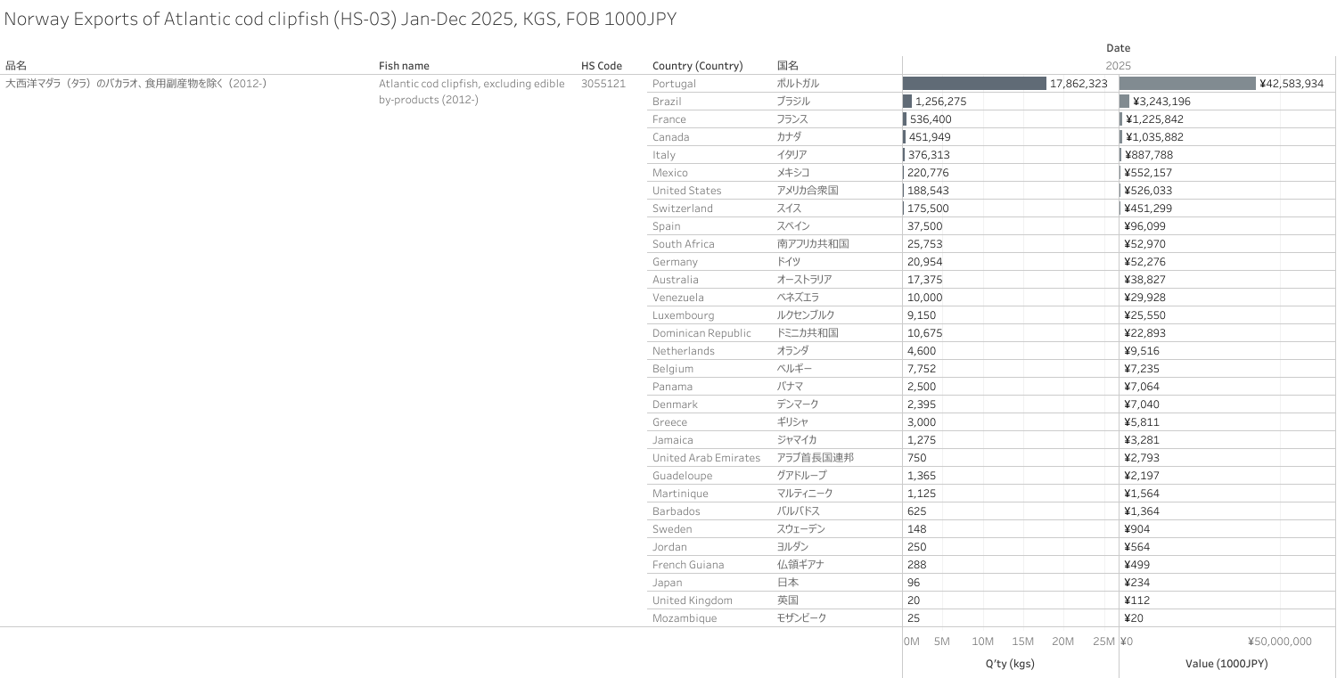 ノルウェー 大西洋マダラのバカラオ(HS-03)輸出統計 2025年01-12月