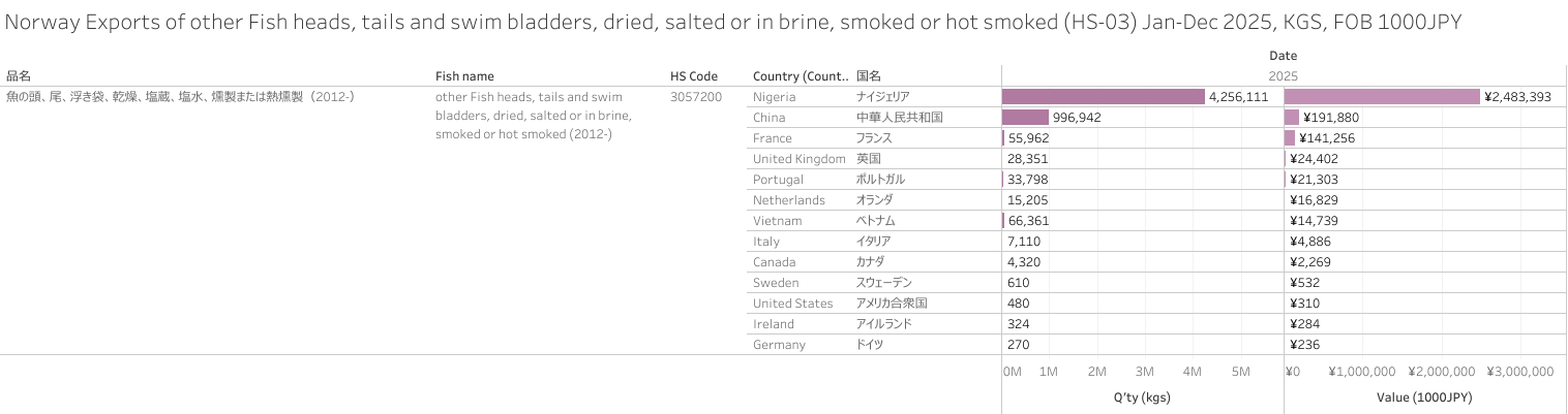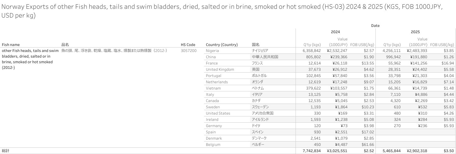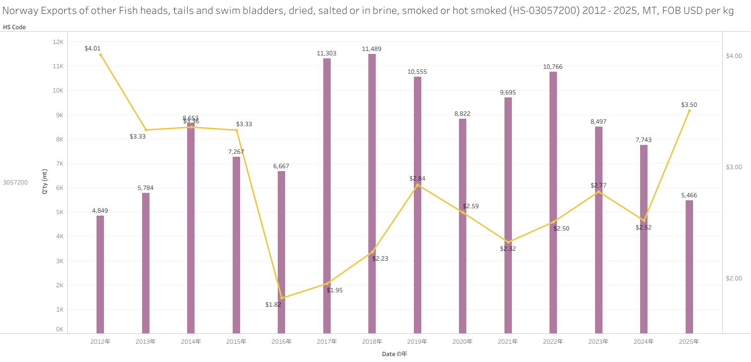 ノルウェー 魚の頭、尾、浮袋、乾燥、塩水、燻製(HS-03)輸出統計 2025年01-12月