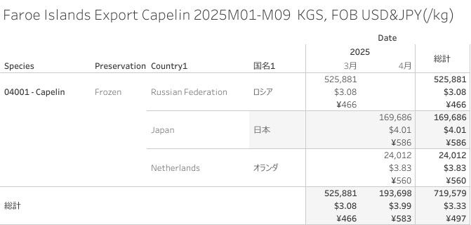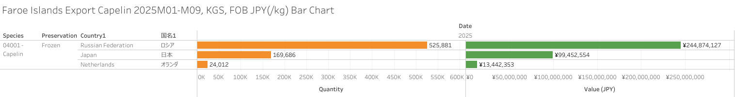 フェロー諸島 カラフトシシャモ 輸出統計 2025年9月