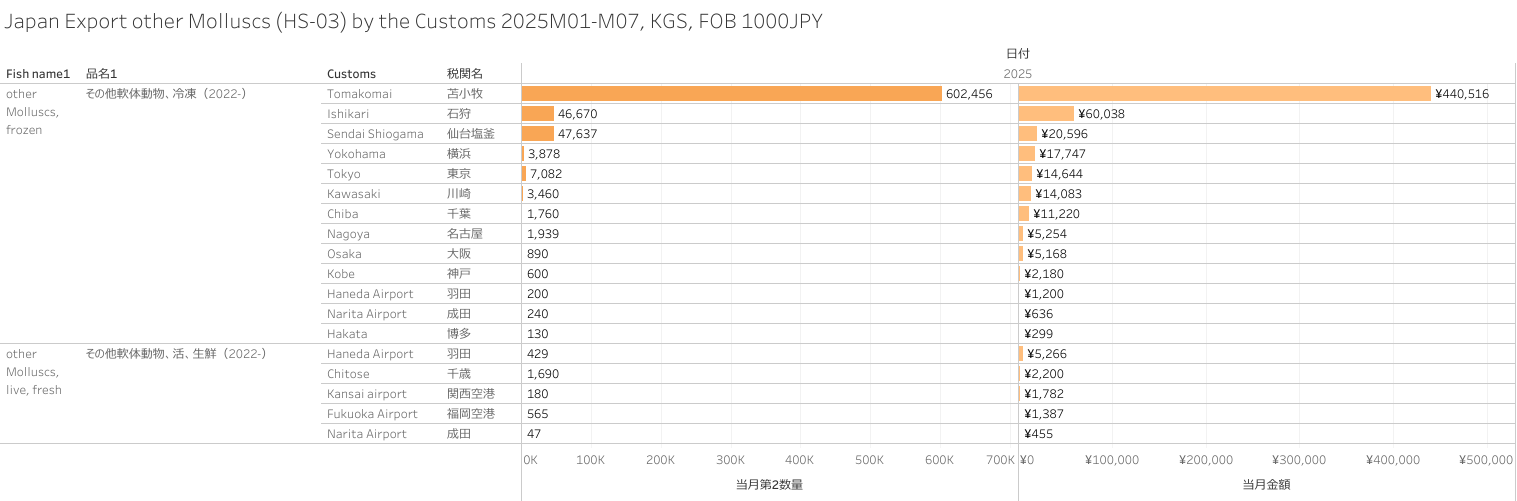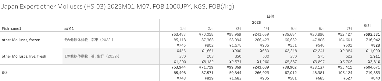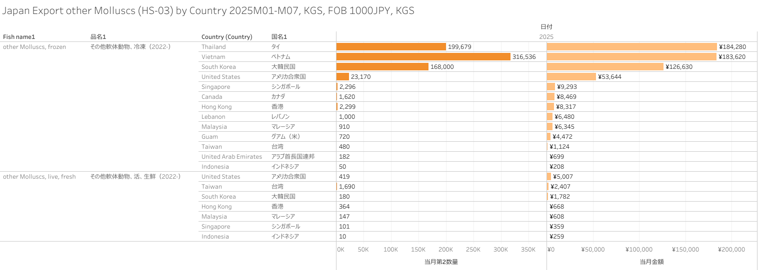 日本 その他軟体動物(HS-03)輸出統計 2025年7月まで