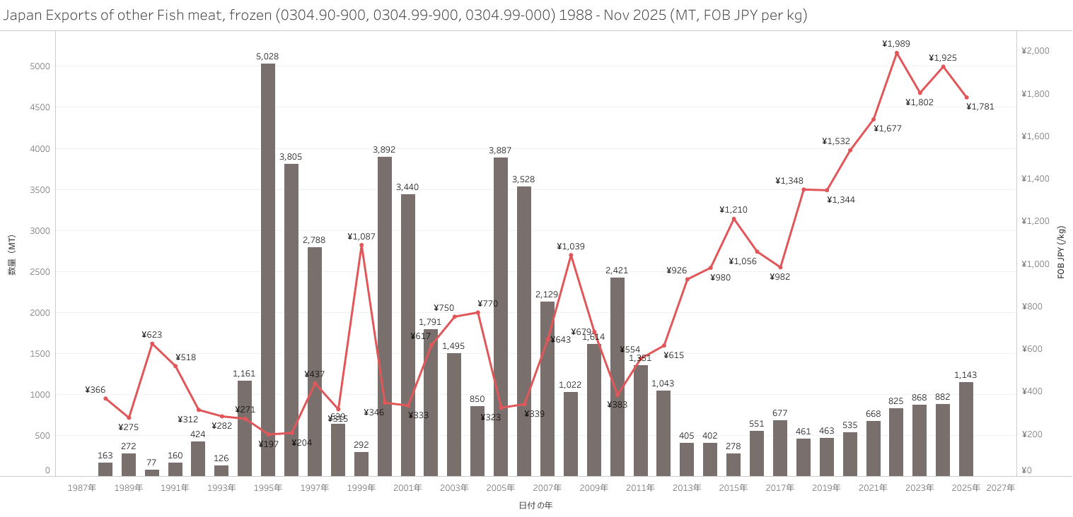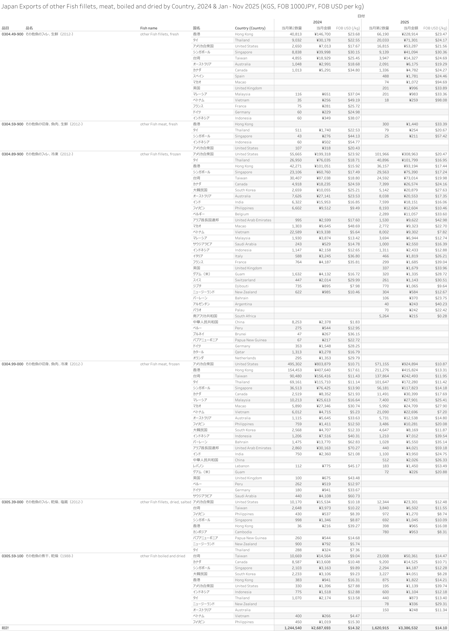 日本 その他魚のフィレ、切身、魚肉、煮干(HS-03)輸出統計 2025年01月-11月