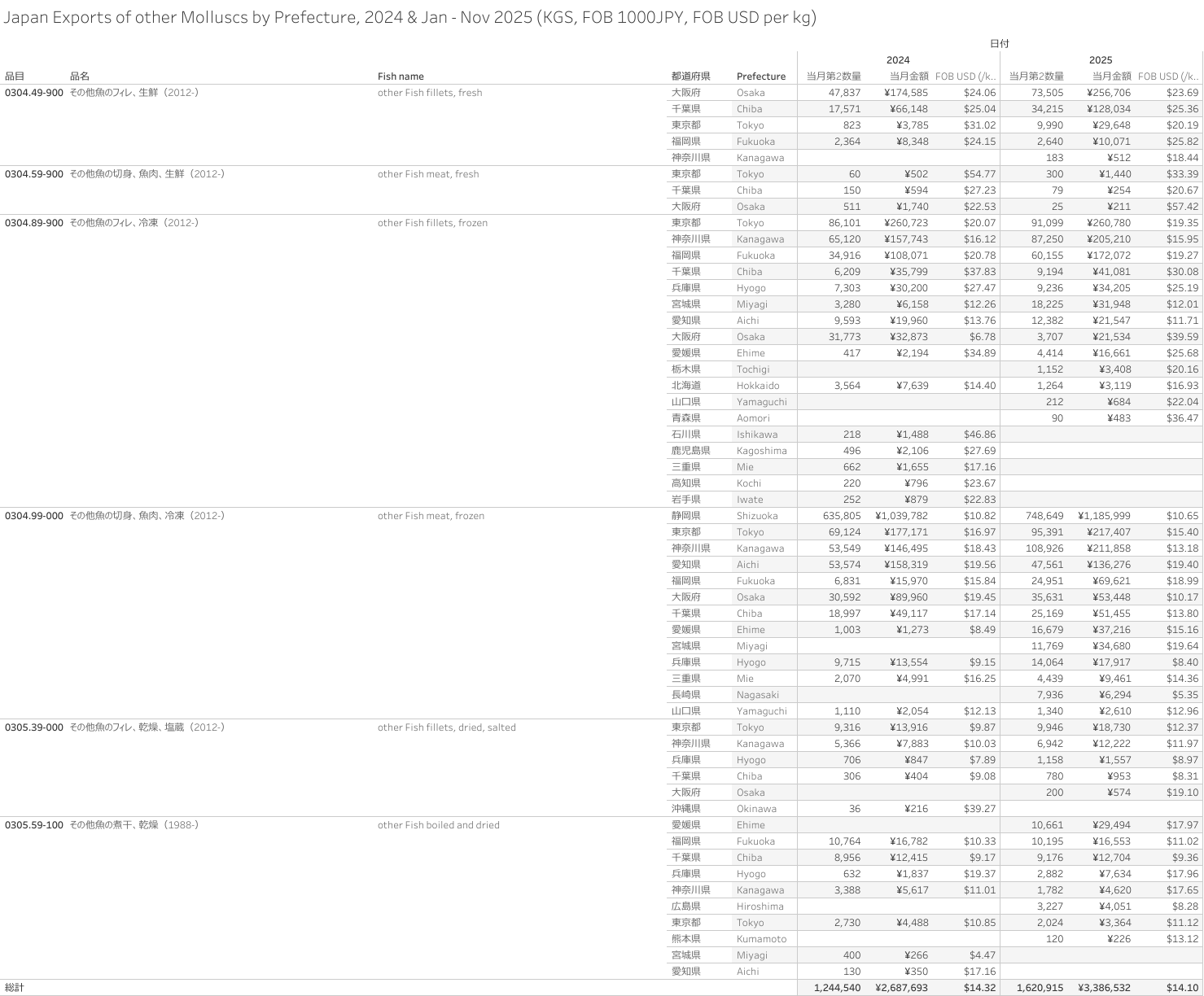 Japan Exports of other Fish fillets, meat, boiled and dried (HS-03) Jan - Nov 2025