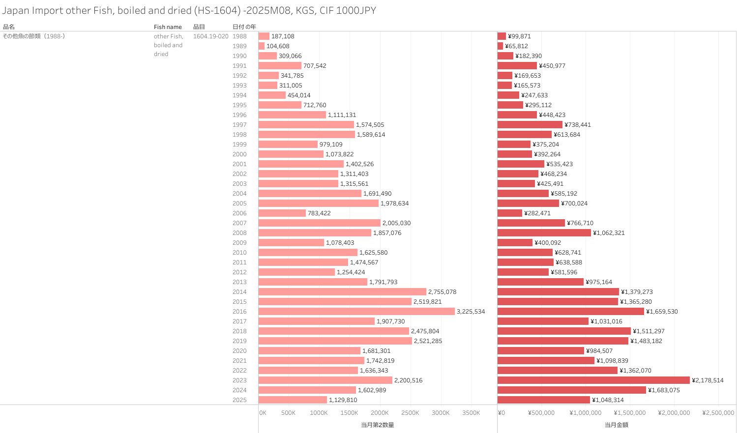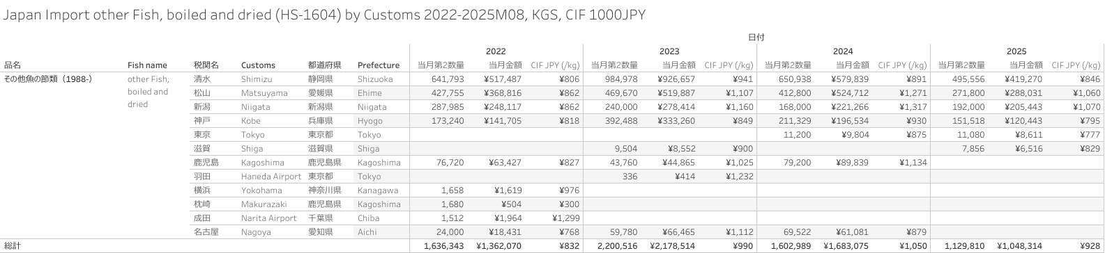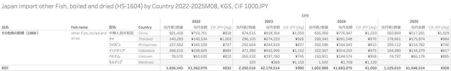 日本 その他魚の節類(HS-1604)輸入統計 2025年8月まで