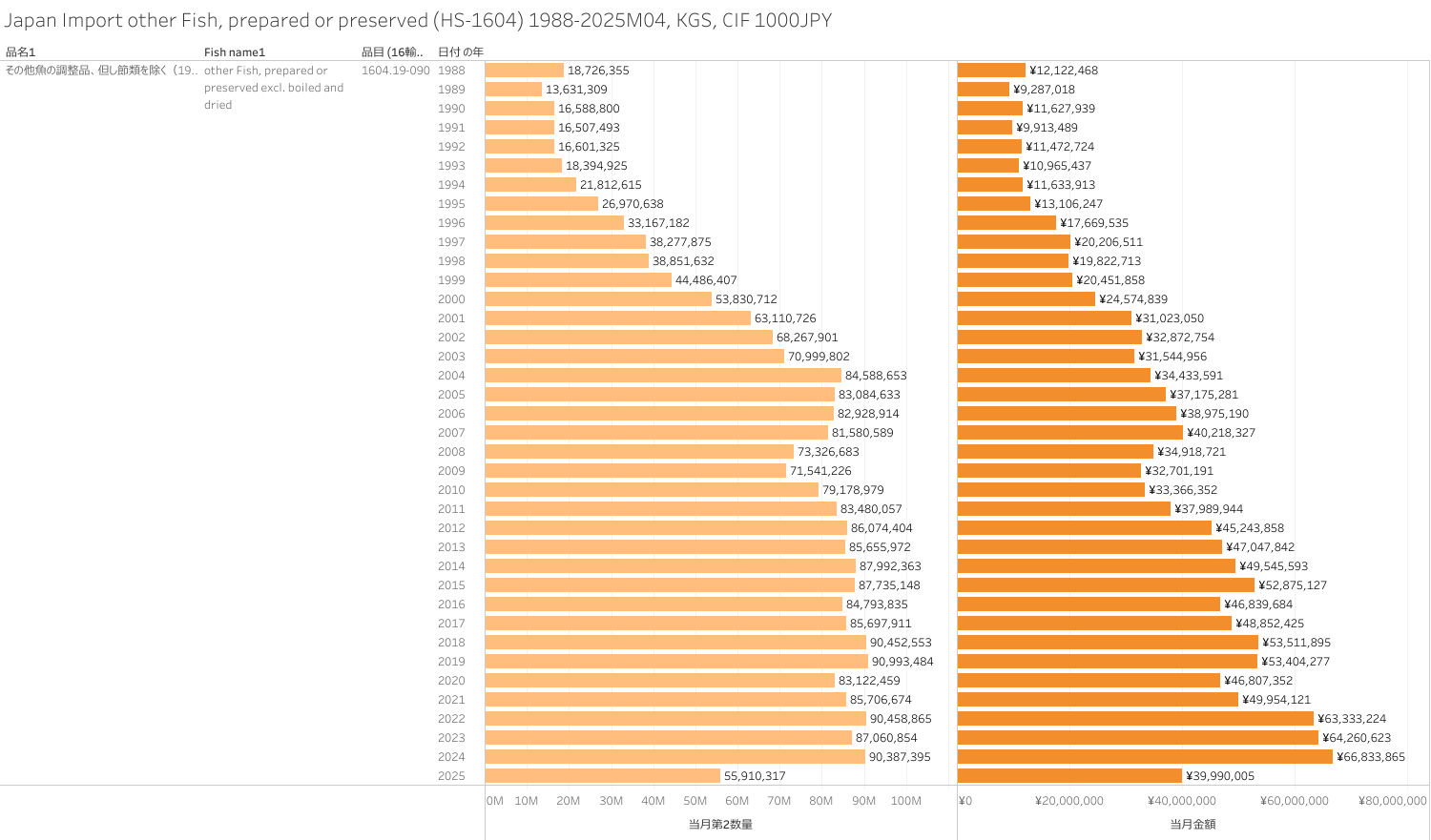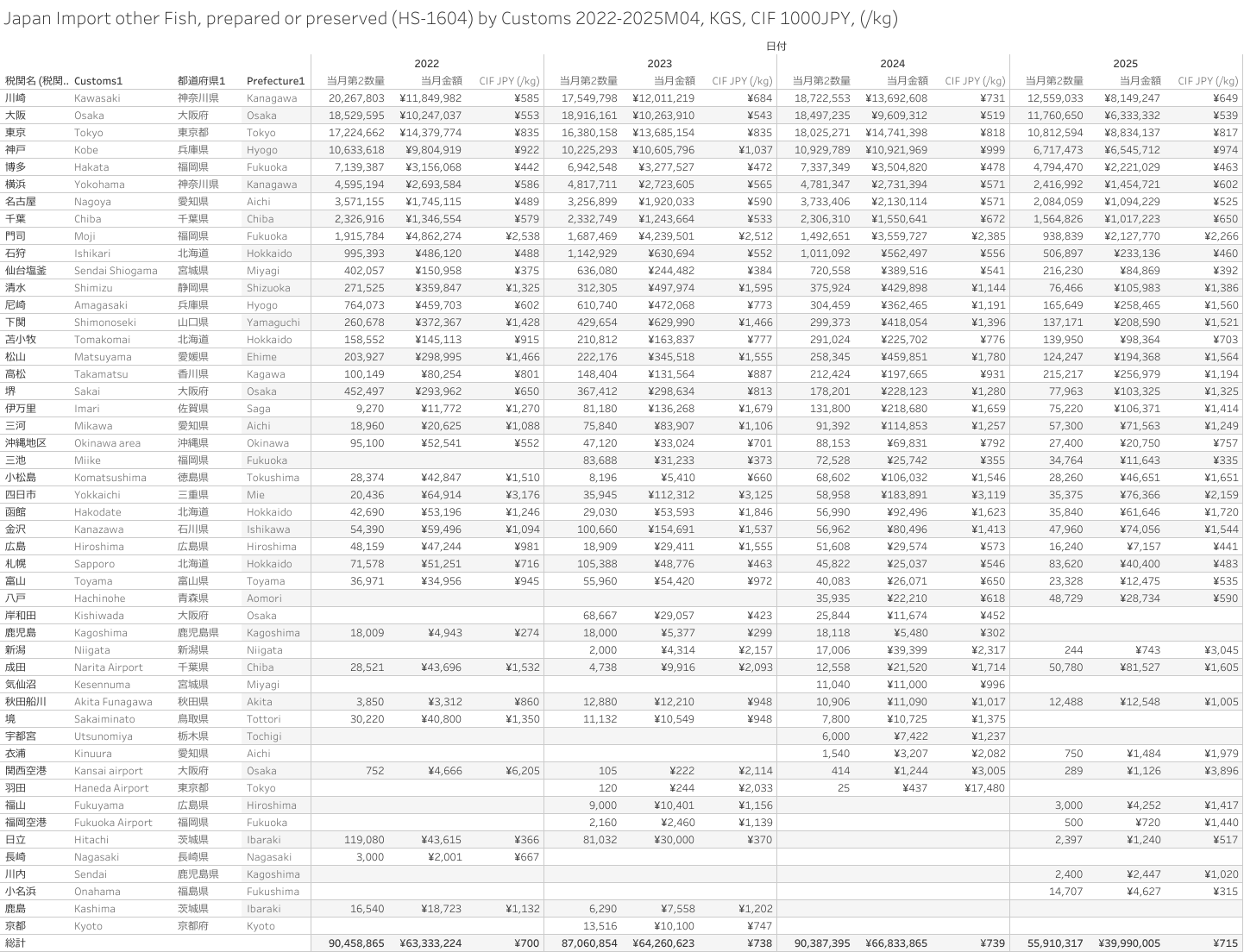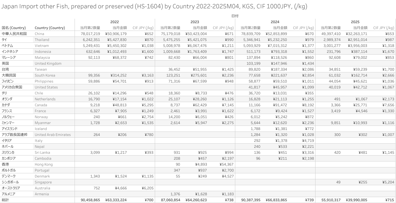 日本 その他魚の調整品(HS-1604)輸入統計 2025年7月まで