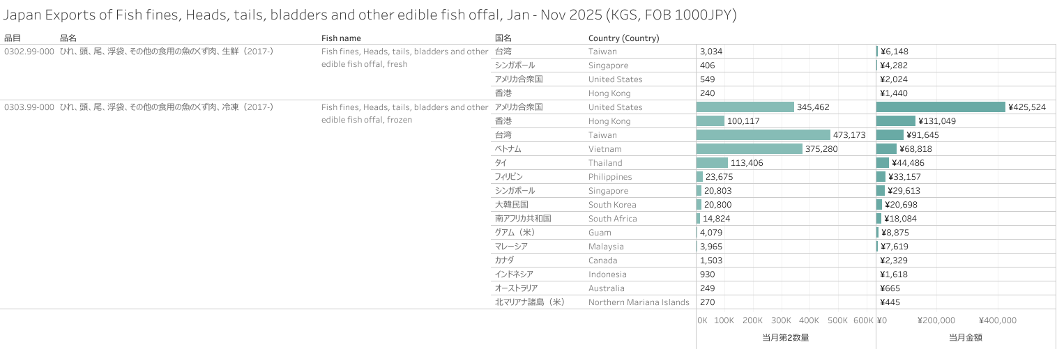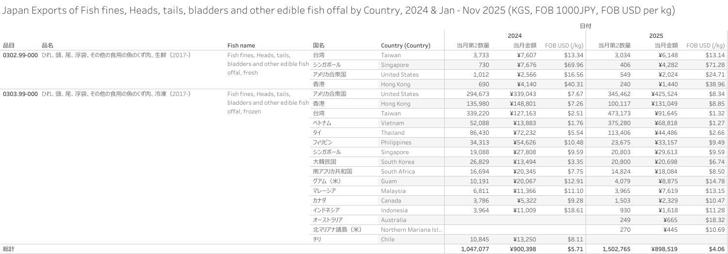 日本 ひれ、頭、尾、浮袋、その他の食用の魚のくず肉(HS-03)輸出統計 2025年01月-11月
