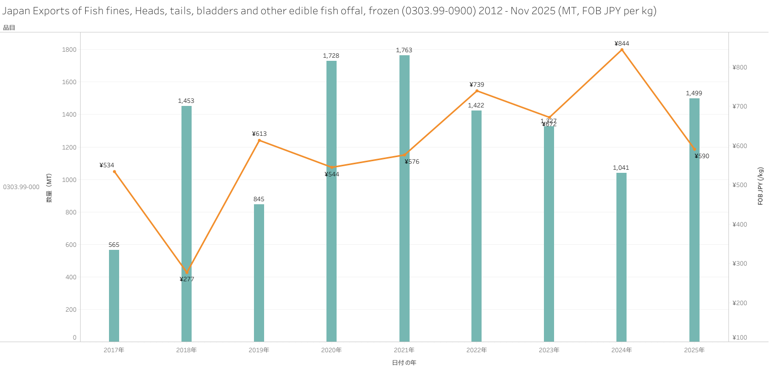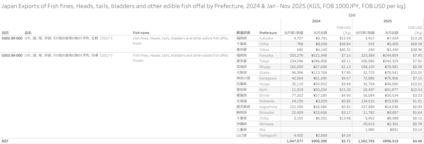 Japan Exports of Fish fines, Heads, tails, bladders and other edible fish offal (HS-03) Jan - Nov 2025