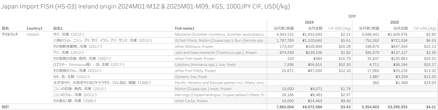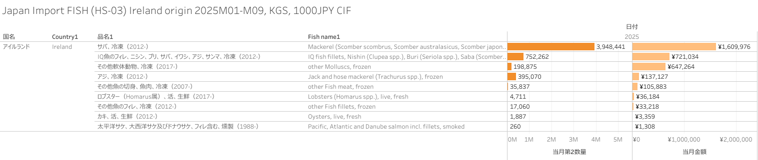 日本 アイルランド産水産物(HS-03)輸入統計 2025年09月まで