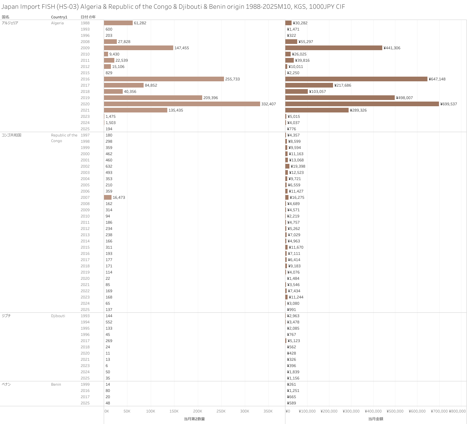 日本 アルジェリア&コンゴ共和国&ジブチ&ベナン産水産物(HS-03)輸入統計 2025年10月まで