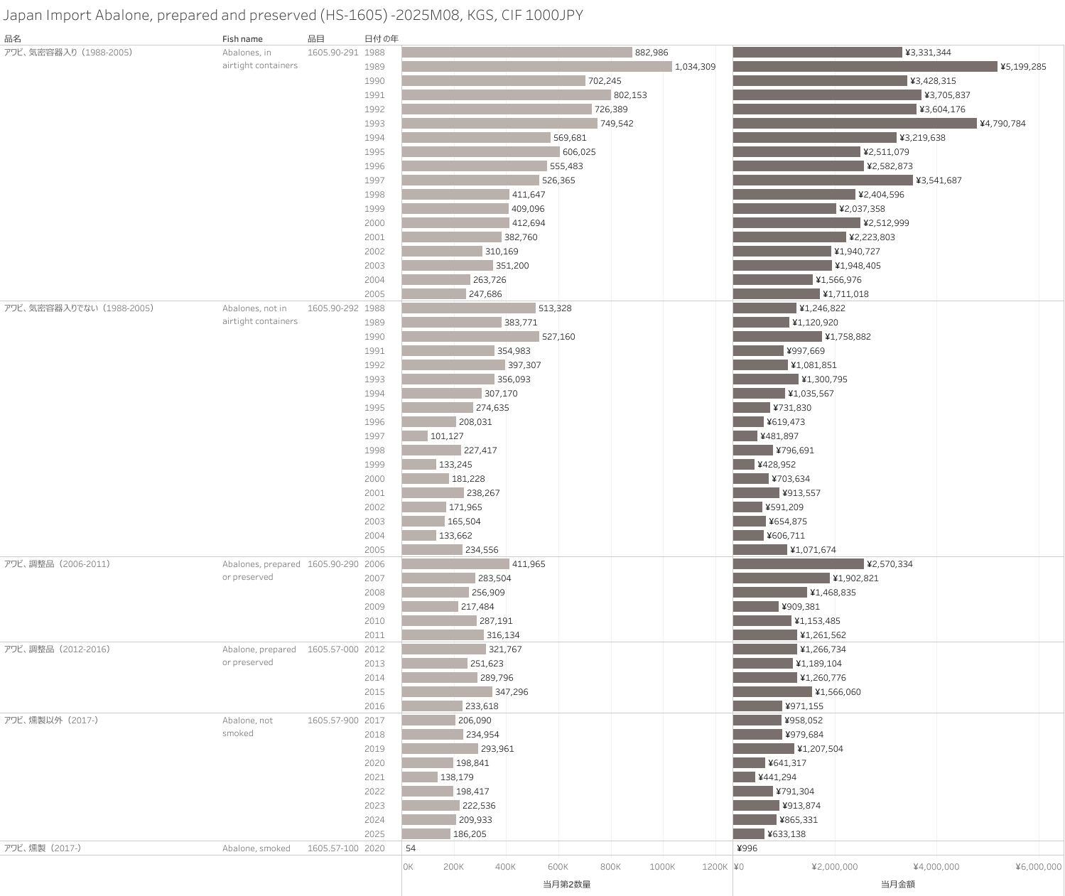 Japan Import Abalone, prepared and preserved (HS-1605) 2025M08