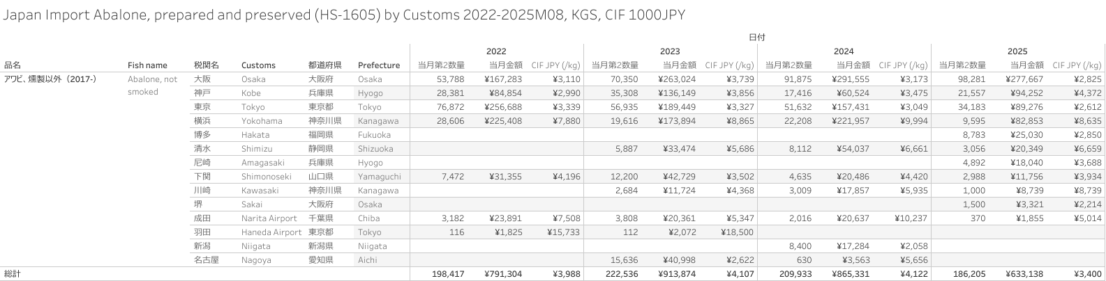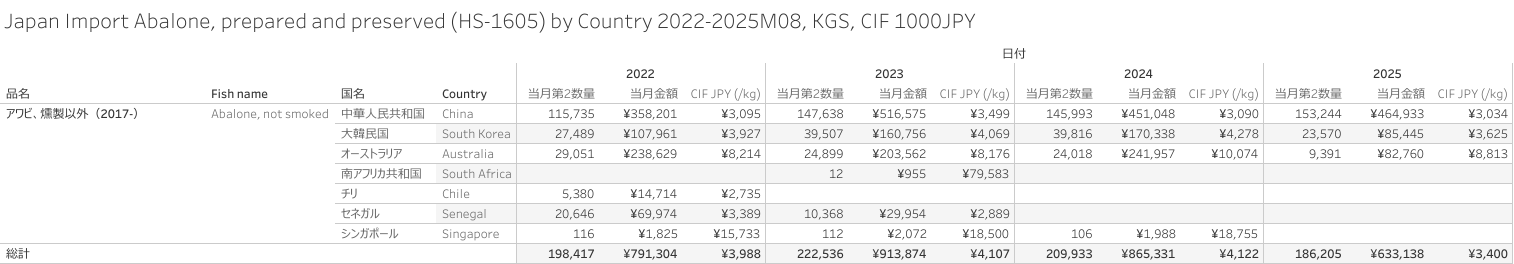 日本 アワビの調整品(HS-1605)輸入統計 2025年8月まで