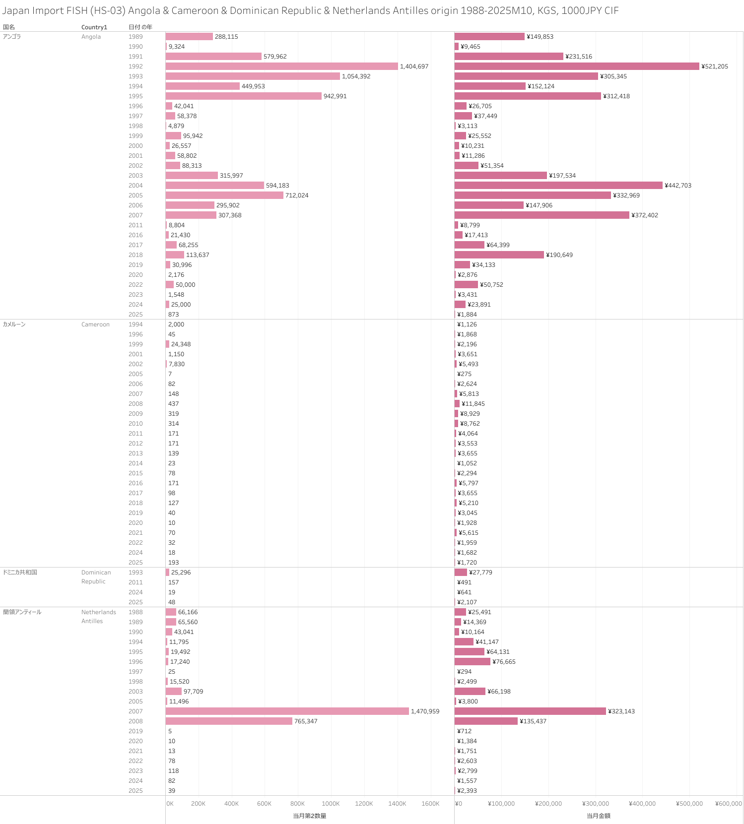 日本 アンゴラ&カメルーン&ドミニカ共和国&蘭領アンティール産水産物(HS-03)輸入統計 2025年10月まで