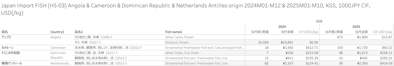 Japan Import FISH (HS-03) Angola & Cameroon & Dominican Republic & Netherlands Antilles origin 2025M10