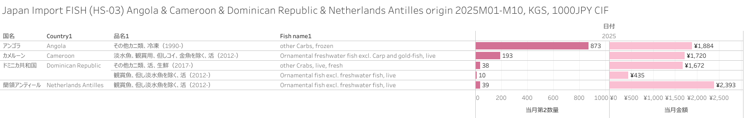 日本 アンゴラ&カメルーン&ドミニカ共和国&蘭領アンティール産水産物(HS-03)輸入統計 2025年10月まで