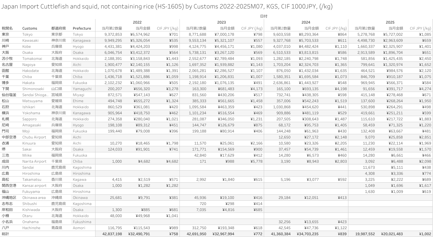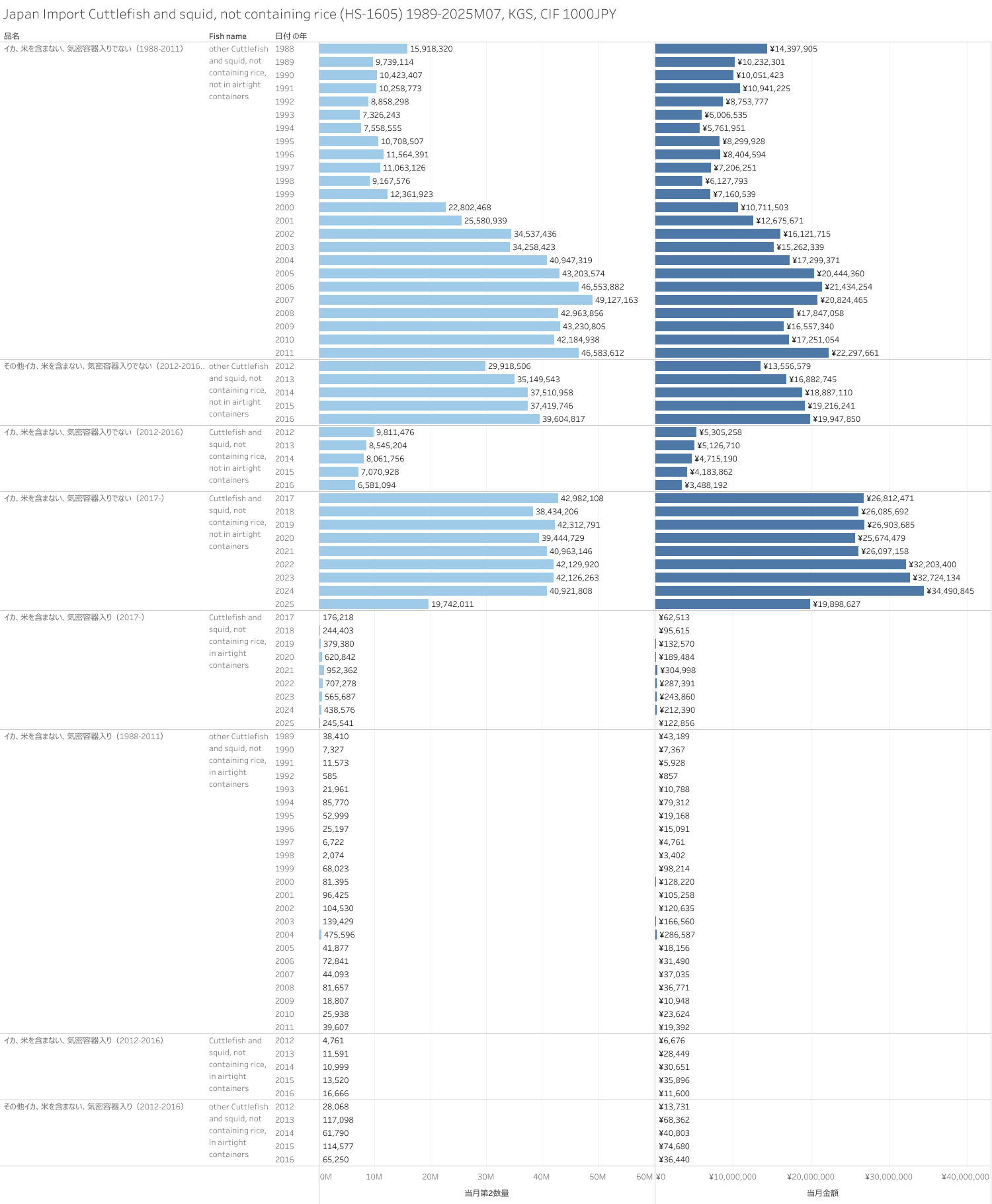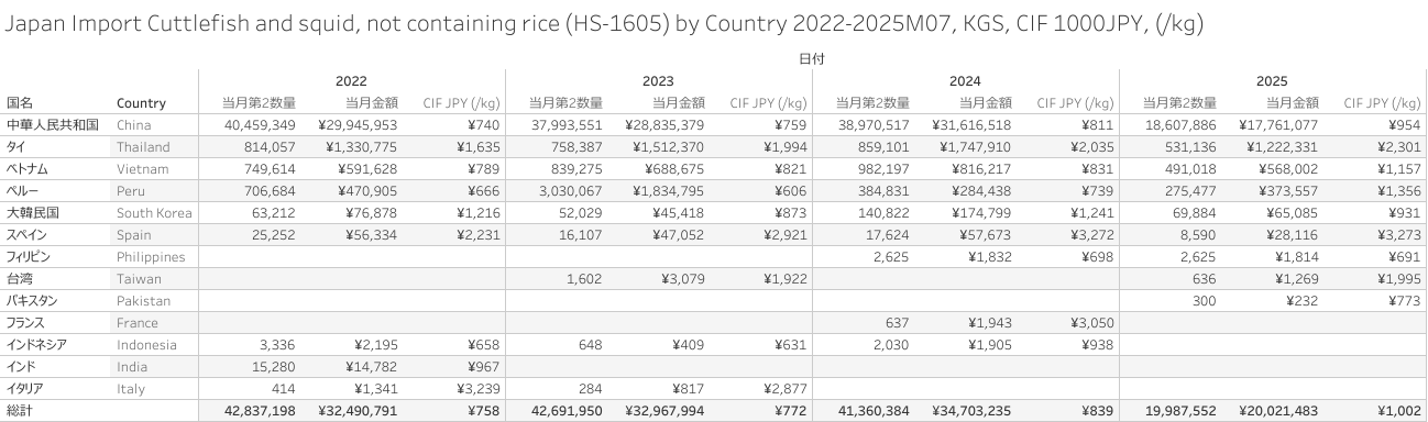 日本 イカ、米を含まない(HS-1605)輸入統計 2025年7月まで