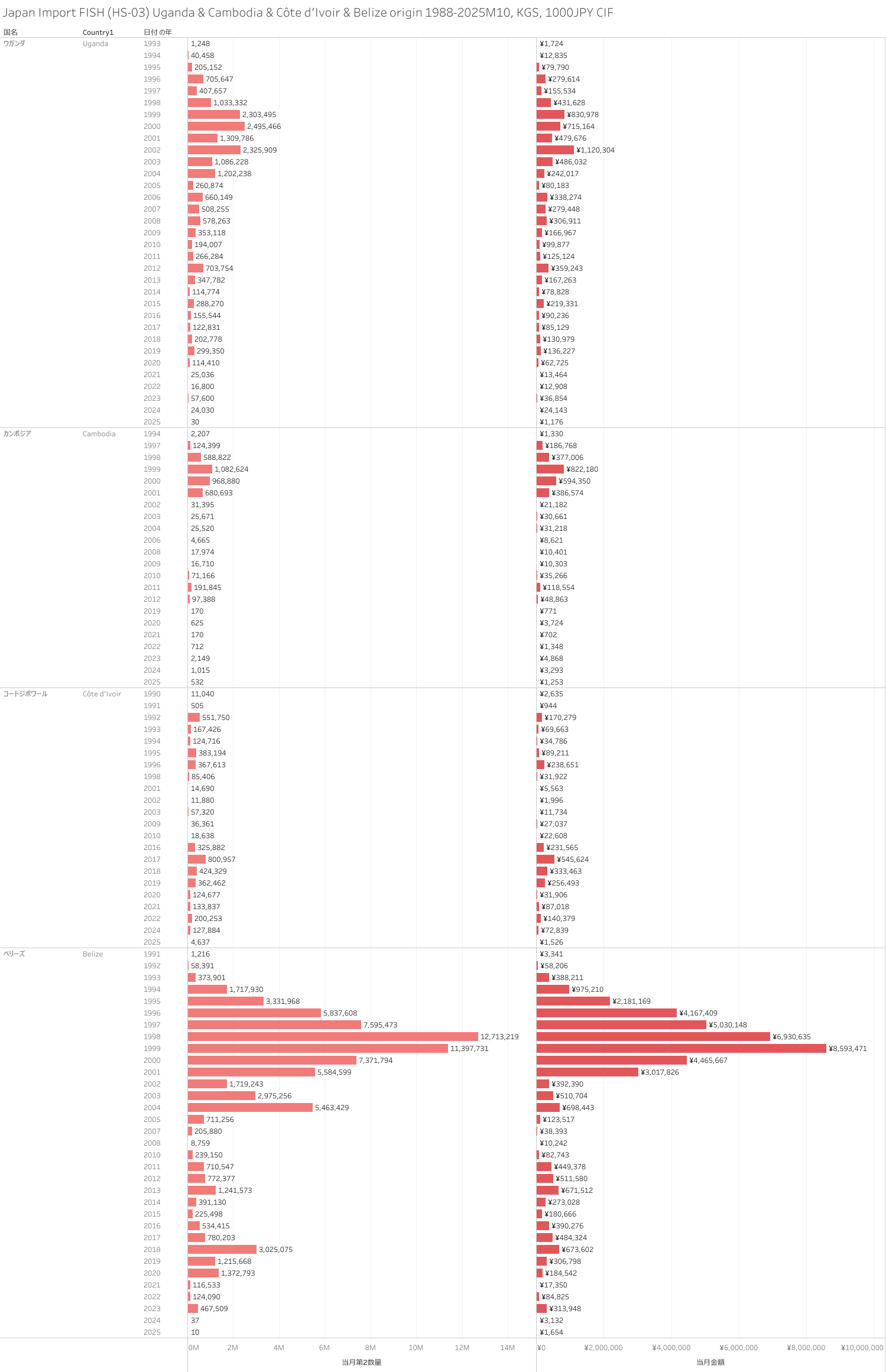 Japan Import FISH (HS-03) Uganda & Cambodia & Côte d'Ivoir & Belize origin 2025M10