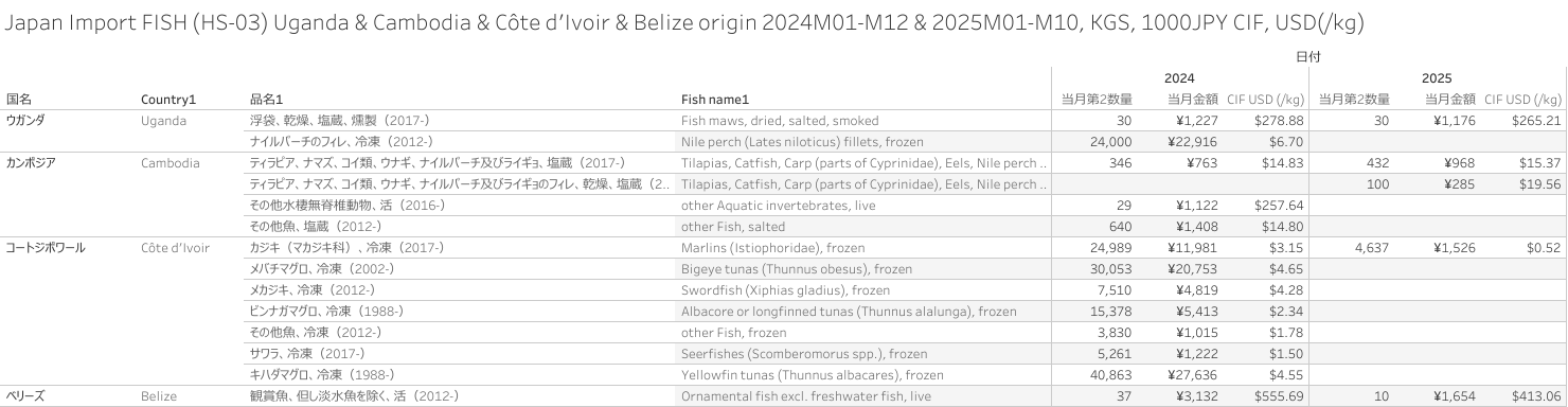 Japan Import FISH (HS-03) Uganda & Cambodia & Côte d'Ivoir & Belize origin 2025M10