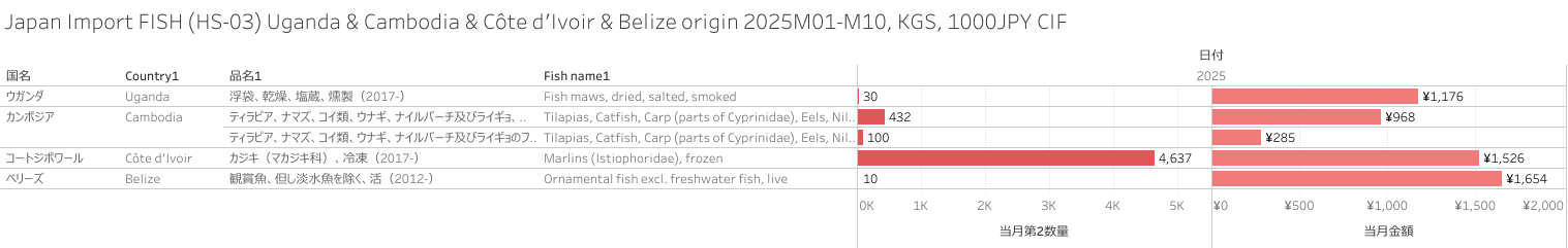 日本 ウガンダ&カンボジア&コートジボワール&ベリーズ産水産物(HS-03)輸入統計 2025年10月まで