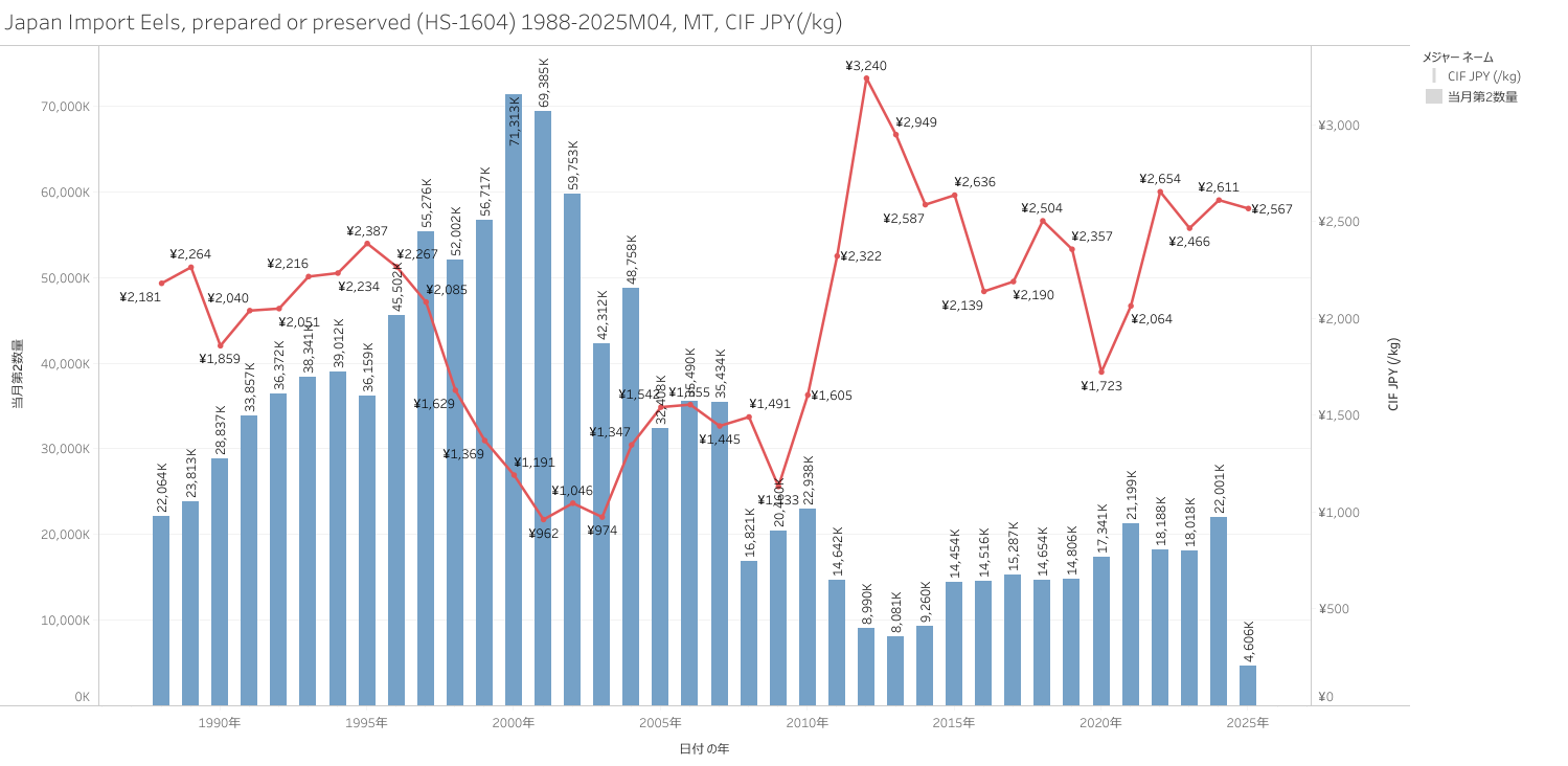 日本 ウナギ 調整品(HS-1604)輸入統計 2025年4月まで