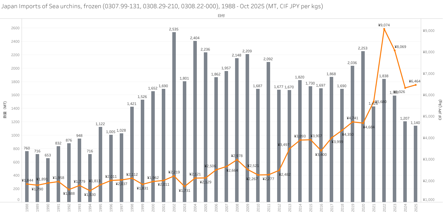 Japan Imports of Sea urchins (HS-03) Jan 2025 - Oct 2025
